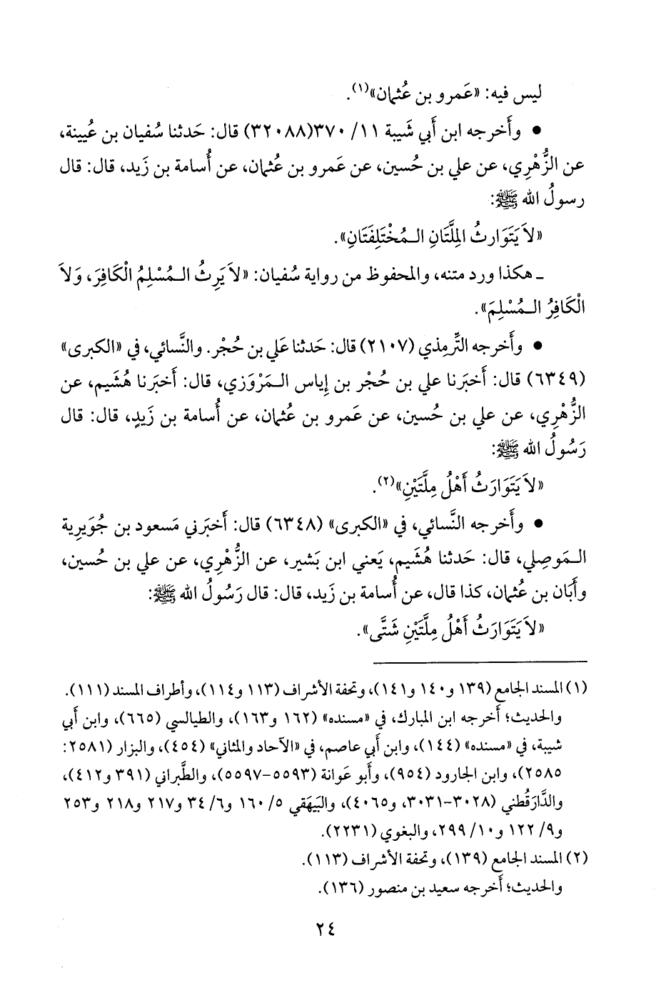 - هكذا ورد متنه، والمحفوظ من رواية سُفيان: "لا يَرِثُ المُسْلِمُ الْكَافِرَ، وَلا الْكَافِرُ المُسْلِمَ".