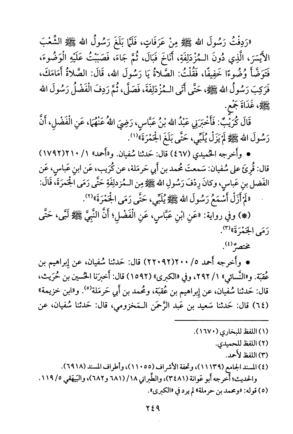 «وكان ردف رسول الله صَلى الله عَليه وسَلم من عرفة، حتى أتى المزدلفة، قال: دفعت مع رسول الله صَلى الله عَليه وسَلم من عرفة، فلما أتى الشعب، نزل فبال، ولم يقل: هراق الماء، ثم أتيته بالإداوة، فتوضأ وضوءا خفيفا، فقلت: الصلاة يا رسول الله، قال: الصلاة أمامكم، فلما أتى جمعا صلى المغرب، ثم حطوا رحالهم، ثم صلى العشاء».