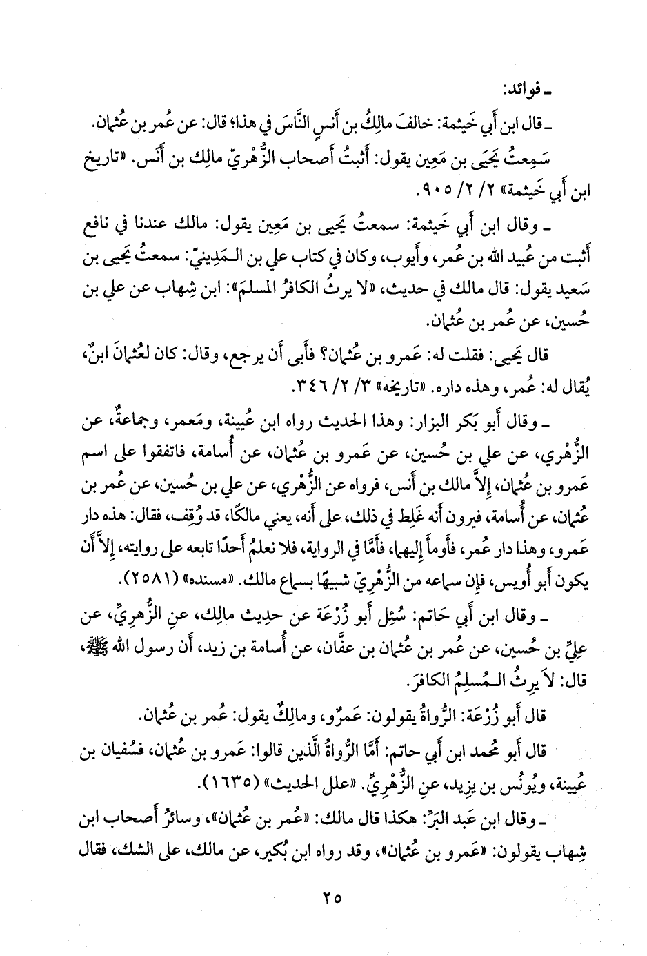 - وقال ابن أَبي حَاتم: سُئِل أبو زُرْعَة عن حدِيث مالِك، عن الزُّهرِيِّ، عن عِليِّ بن حُسين، عن عُمر بن عُثمان بن عفَّان، عن أُسامة بن زيد، أَن رسول الله - صلى الله عليه وسلم -، قال: لا يرِثُ المُسلِمُ الكافرَ.