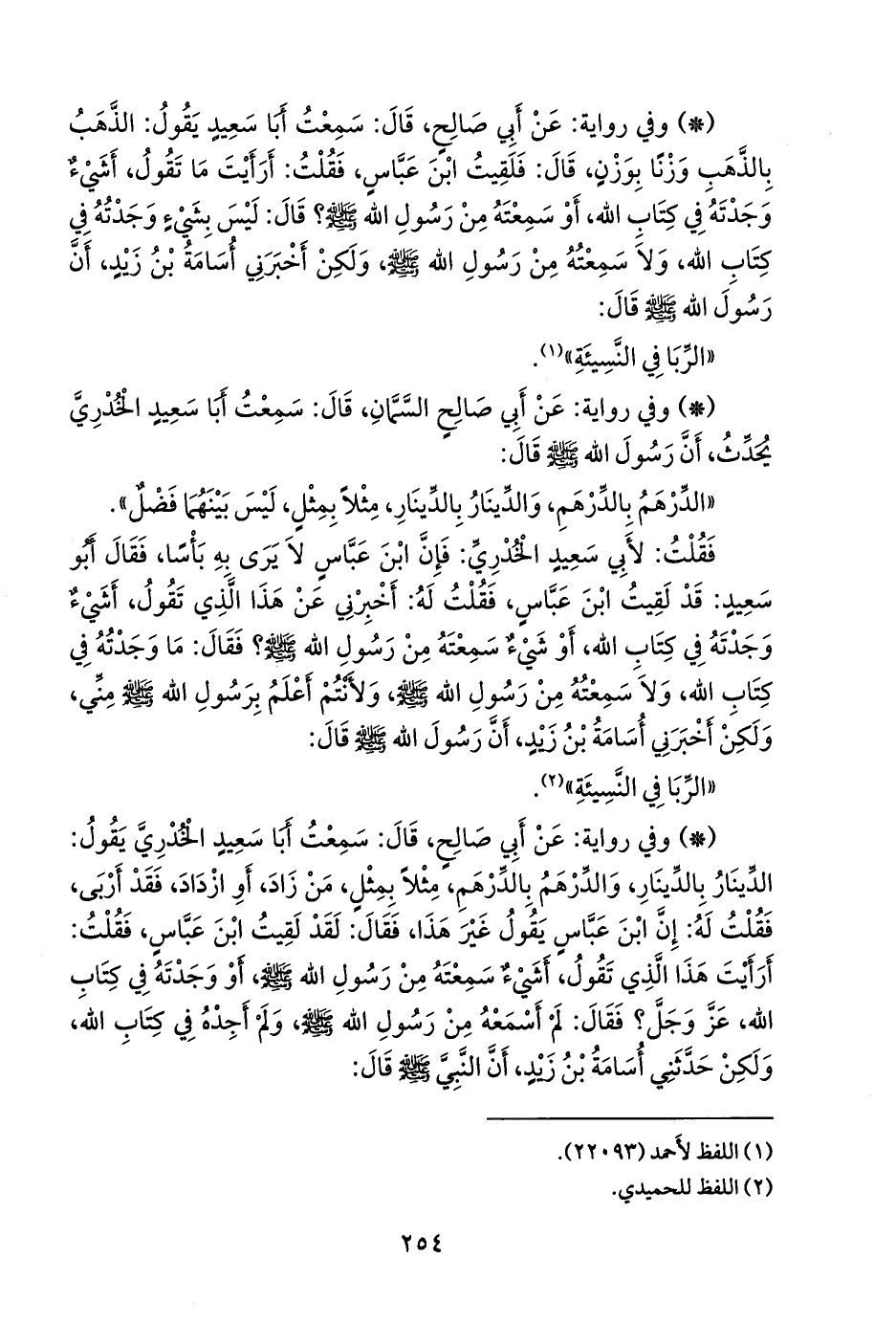 - وفي رواية: عن أبي صالح، قال: سمعت أبا سعيد الخُدْري يقول: الدينار بالدينار، والدرهم بالدرهم، مثلا بمثل، من زاد، أو ازداد، فقد أربى، فقلت له: إن ابن عباس يقول غير هذا، فقال: لقد لقيت ابن عباس، فقلت: أرأيت هذا الذي تقول، أشيء سمعته من رسول الله صَلى الله عَليه وسَلم أو وجدته في كتاب الله، عز وجل؟ فقال: لم أسمعه من رسول الله صَلى الله عَليه وسَلم ولم أجده في كتاب الله، ولكن حدثني أُسامة بن زيد، أن النبي صَلى الله عَليه وسَلم قال: