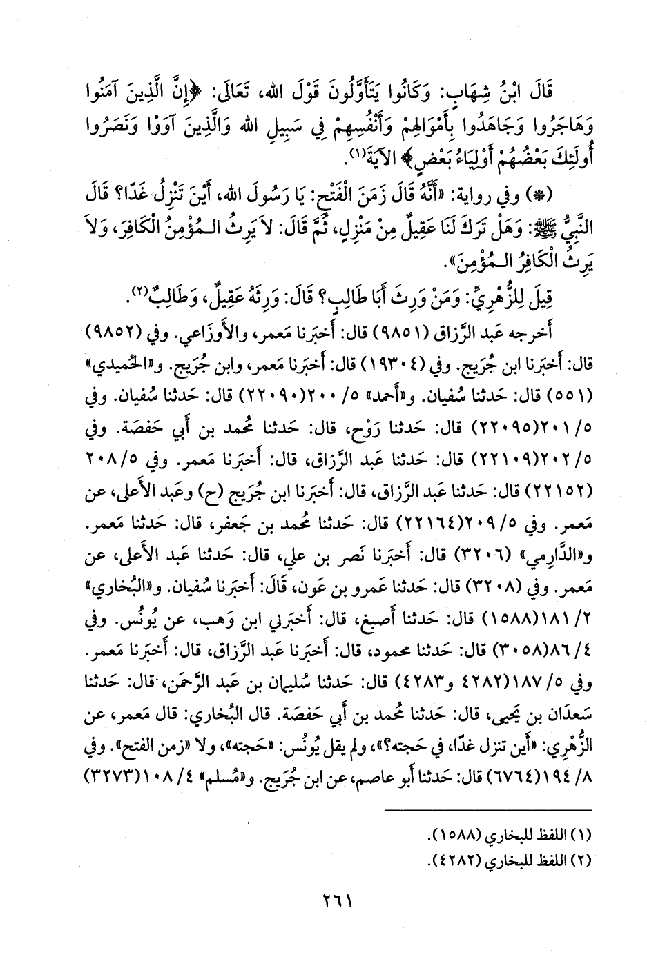 قال ابن شهاب: وكانوا يتأولون قول الله، تعالى: {إن الذين آمنوا وهاجروا وجاهدوا بأموالهم وأنفسهم في سبيل الله والذين آووا ونصروا أولئك بعضهم أولياء بعض} الآية (¬١).