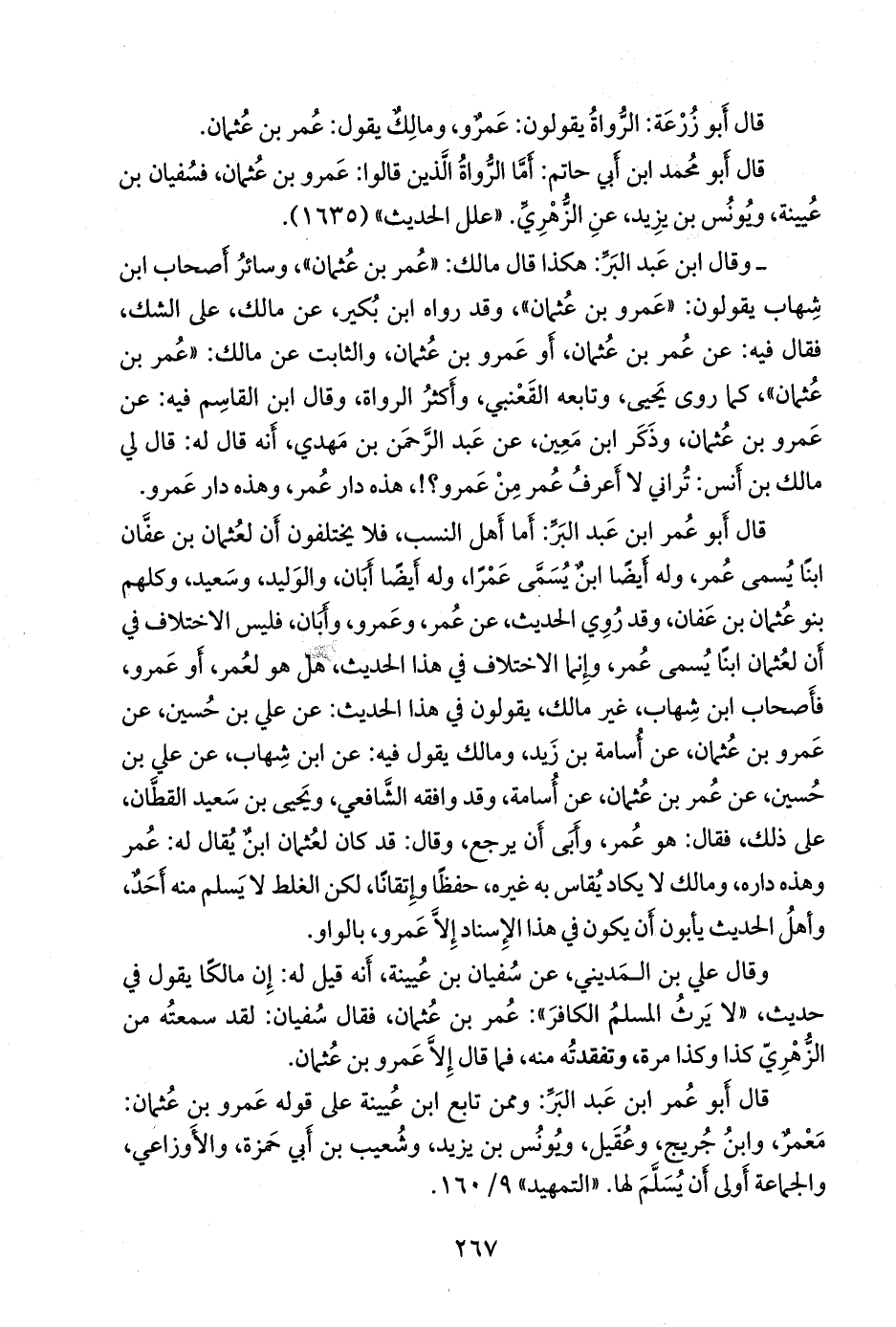 قال أَبو عمر ابن عبد البَر: أما أهل النسب، فلا يختلفون أن لعثمان بن عفان ابنا يسمى عمر، وله أيضا ابن يسمى عمرا، وله أيضا أبان، والوليد، وسعيد، وكلهم بنو عثمان بن عفان، وقد روي الحديث، عن عمر، وعَمرو، وأبان، فليس الاختلاف في أن لعثمان ابنا يسمى عمر، وإنما الاختلاف في هذا الحديث، هل هو لعمر، أو عَمرو، فأصحاب ابن شهاب، غير مالك، يقولون في هذا الحديث: عن علي بن حسين، عن عَمرو بن عثمان، عن أُسامة بن زيد، ومالك يقول فيه: عن ابن شهاب، عن علي بن حسين، عن عمر بن عثمان، عن أُسامة، وقد وافقه الشافعي، ويحيى بن سعيد القطان، على ذلك، فقال: هو عمر، وأبى أن يرجع، وقال: قد كان لعثمان ابن يقال له: عمر وهذه داره، ومالك لا يكاد يقاس به غيره، حفظا وإتقانا، لكن الغلط لا يسلم منه أحد، وأهل الحديث يأَبون أن يكون في هذا الإسناد إلا عَمرو، بالواو.