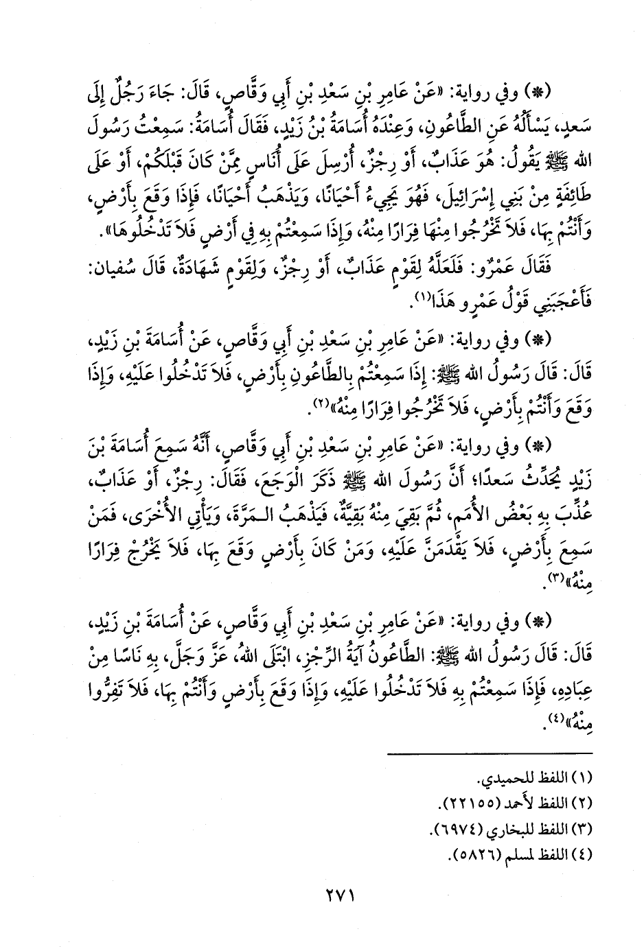 - وفي رواية: «عن عامر بن سعد، عن أُسامة بن زيد، عن رسول الله صَلى الله عَليه وسَلم أنه قال: إن هذا الوجع، أو السقم، رجز عذب به بعض الأمم قبلكم، ثم بقي بعد بالأرض، فيذهب المرة ويأتي الأخرى، فمن سمع به بأرض، فلا يقدمن عليه، ومن وقع بأرض وهو بها، فلا يخرجنه الفرار منه» (¬٤).