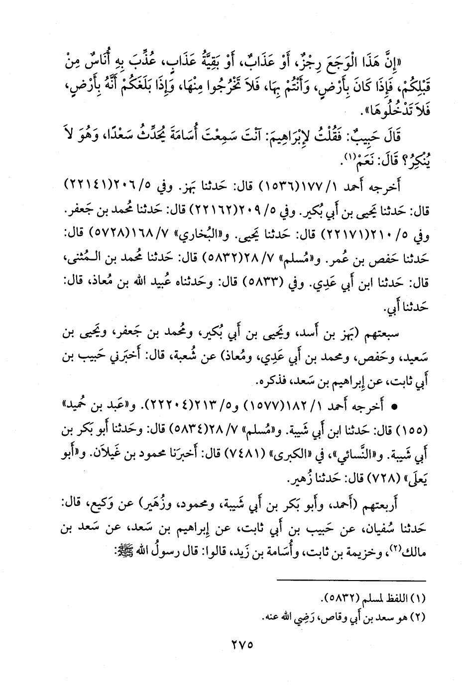 أربعتهم (أحمد، وأَبو بكر بن أبي شيبة، ومحمود، وزهير) عن وكيع بن الجراح، قال: حدثنا سفيان، عن حبيب بن أبي ثابت، عن إبراهيم بن سعد، عن سعد بن مالك (¬١)، وخزيمة بن ثابت، وأُسامة بن زيد، قالوا: قال رسول الله صَلى الله عَليه وسَلم:
