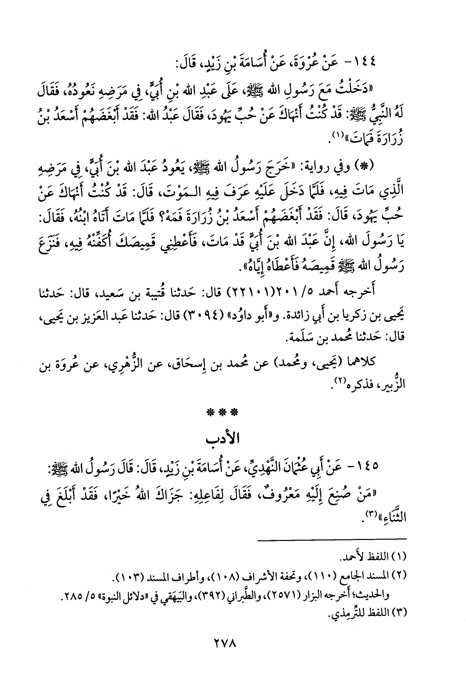 ١٤٤ - عن عروة، عن أُسامة بن زيد، قال: