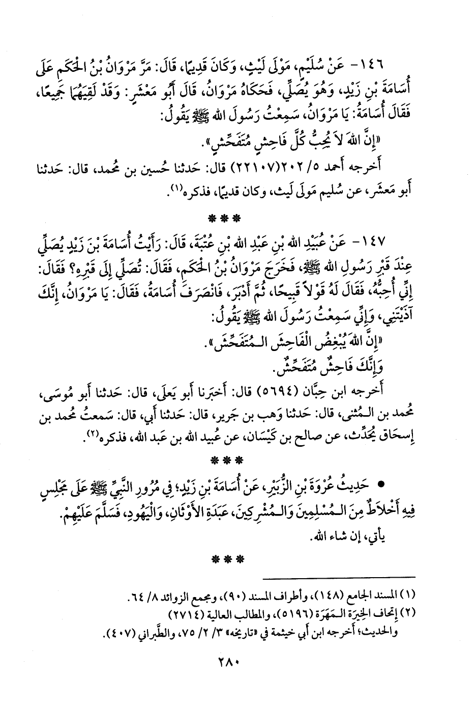 ١٤٧ - عن عُبيد الله بن عبد الله بن عُتبة، قال: رأيت أُسامة بن زيد يصلي عند قبر رسول الله صَلى الله عَليه وسَلم فخرج مروان بن الحكم، فقال: تصلي إلى قبره؟ فقال: إني أحبه، فقال له قولا قبيحا، ثم أدبر، فانصرف أُسامة، فقال: يا مروان، إنك آذيتني، وإني سمعت رسول الله صَلى الله عَليه وسَلم يقول:
