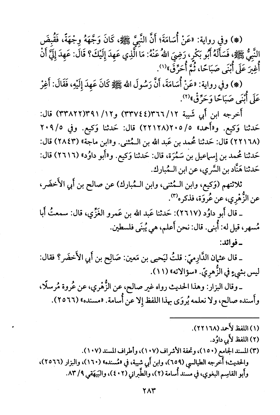 - وقال البزار: هذا الحديث رواه غير صالح، عن الزُّهْري، عن عُروة مُرسَلًا، وأَسنده صالح، ولا نعلمه يُروى بهذا اللفظ إِلا عن أُسامة. «مسنده» (٢٥٦٦).