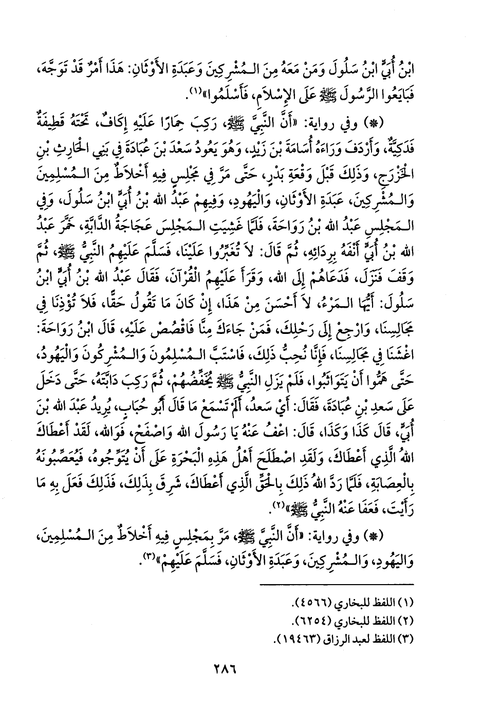 - وفي رواية: «أن النبي صَلى الله عَليه وسَلم ركب حمارا عليه إكاف، تحته قطيفة فدكية، وأردف وراءه أُسامة بن زيد، وهو يعود سعد بن عبادة في بني الحارث بن الخزرج، وذلك قبل وقعة بدر، حتى مر في مجلس فيه أخلاط من المسلمين والمشركين، عبدة الأوثان، واليهود، وفيهم عبد الله بن أبي ابن سلول، وفي المجلس عبد الله بن رَوَاحة، فلما غشيت المجلس عجاجة الدابة، خمر عبد الله بن أبي أنفه بردائه، ثم قال: لا تغبروا علينا، فسلم عليهم النبي صَلى الله عَليه وسَلم ثم وقف فنزل، فدعاهم إلى الله، وقرأ عليهم القرآن، فقال عبد الله بن أبي ابن سلول: أيها المرء، لا أحسن من هذا، إن كان ما تقول حقا، فلا تؤذنا في مجالسنا، وارجع إلى رحلك، فمن جاءك منا فاقصص عليه، قال ابن رَوَاحة: اغشنا في مجالسنا، فإنا نحب ذلك، فاستب المسلمون والمشركون واليهود، حتى هموا أن يتواثبوا، فلم يزل النبي صَلى الله عَليه وسَلم يخفضهم، ثم ركب دابته، حتى دخل على سعد بن عبادة، فقال: أي سعد، ألم تسمع ما قال أَبو حباب، يريد عبد الله بن أبي، قال كذا وكذا، قال: اعف عنه يا رسول الله واصفح، فوالله، لقد أعطاك الله الذي أعطاك، ولقد اصطلح أهل هذه البحرة على أن يتوجوه، فيعصبونه بالعصابة، فلما رد الله ذلك بالحق الذي أعطاك، شرق بذلك، فذلك فعل به ما رأيت، فعفا عنه النبي صَلى الله عَليه وسَلم» (¬١).