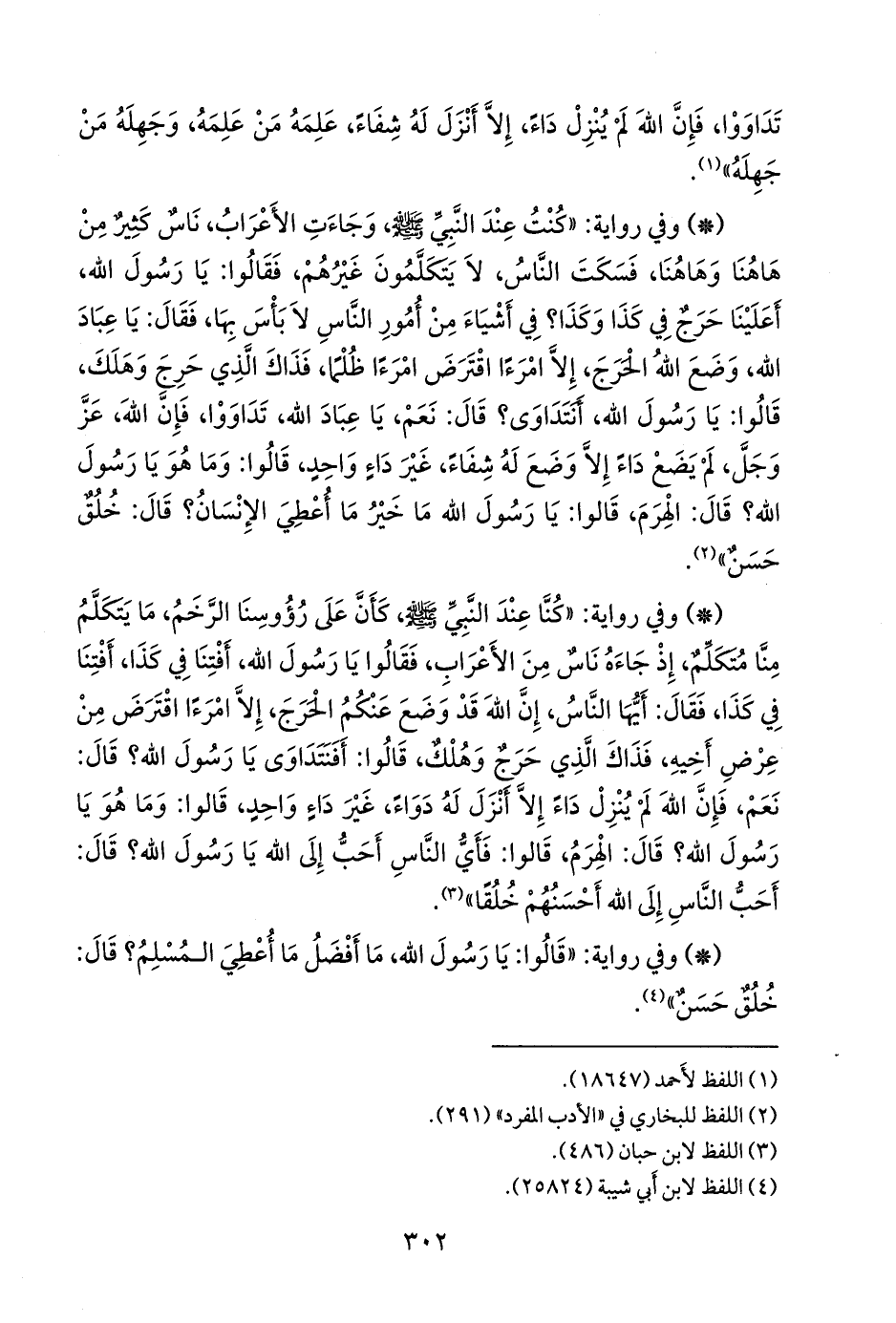 - وفي رواية: «كنت عند النبي صَلى الله عَليه وسَلم وجاءت الأعراب، ناس كثير من هاهنا وهاهنا، فسكت الناس، لا يتكلمون غيرهم، فقالوا: يا رسول الله، أعلينا حرج في كذا وكذا؟ في أشياء من أمور الناس لا بأس بها، فقال: يا عباد الله، وضع الله الحرج، إلا امرءا اقترض امرءا ظلما، فذاك الذي حرج وهلك، قالوا: يا رسول الله، أنتداوى؟ قال: نعم، يا عباد الله، تداووا، فإن الله، عز وجل، لم يضع داء إلا وضع له شفاء، غير داء واحد، قالوا: وما هو يا رسول الله؟ قال: الهرم، قالوا: يا رسول الله ما خير ما أعطي الإنسان؟ قال: خلق حسن» (¬١).