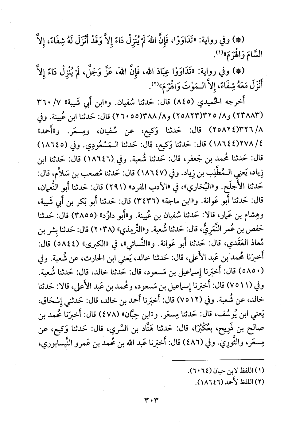 - وفي رواية: «تداووا عباد الله، فإن الله، عز وجل، لم ينزل داء إلا أنزل معه شفاء، إلا الموت والهرم» (¬١).