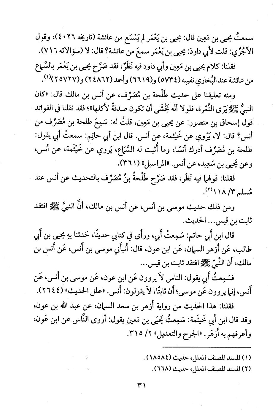 ومنه تعليقنا على حديث طَلْحة بن مُصَرِّف، عن أَنس بن مالك قال: "كان النبيُّ - صلى الله عليه وسلم - يَرَى التَّمْرة، فلولا أنّه يَخْشَى أن تكون صدقةً لأكلها"؛ فقد نقلنا في الفوائد قول إسحاق بن منصور: عن يحيى بن مَعِين، قلتُ له: سَمِعَ طلحة بن مُصَرِّف من أَنس؟ قال: لا، يَرْوي عن خَيْثمة، عن أَنس. قال ابن أبي حاتِم: سمعتُ أبي يقول: طلحة بن مُصَرِّف أدرك أنسًا، وما أُثبت له السَّمَاع، يَروي عن خَيْثَمة، عن أَنس، وعن يَحيى بن سَعِيد، عن أَنس. "المراسيل" (٣٦١).