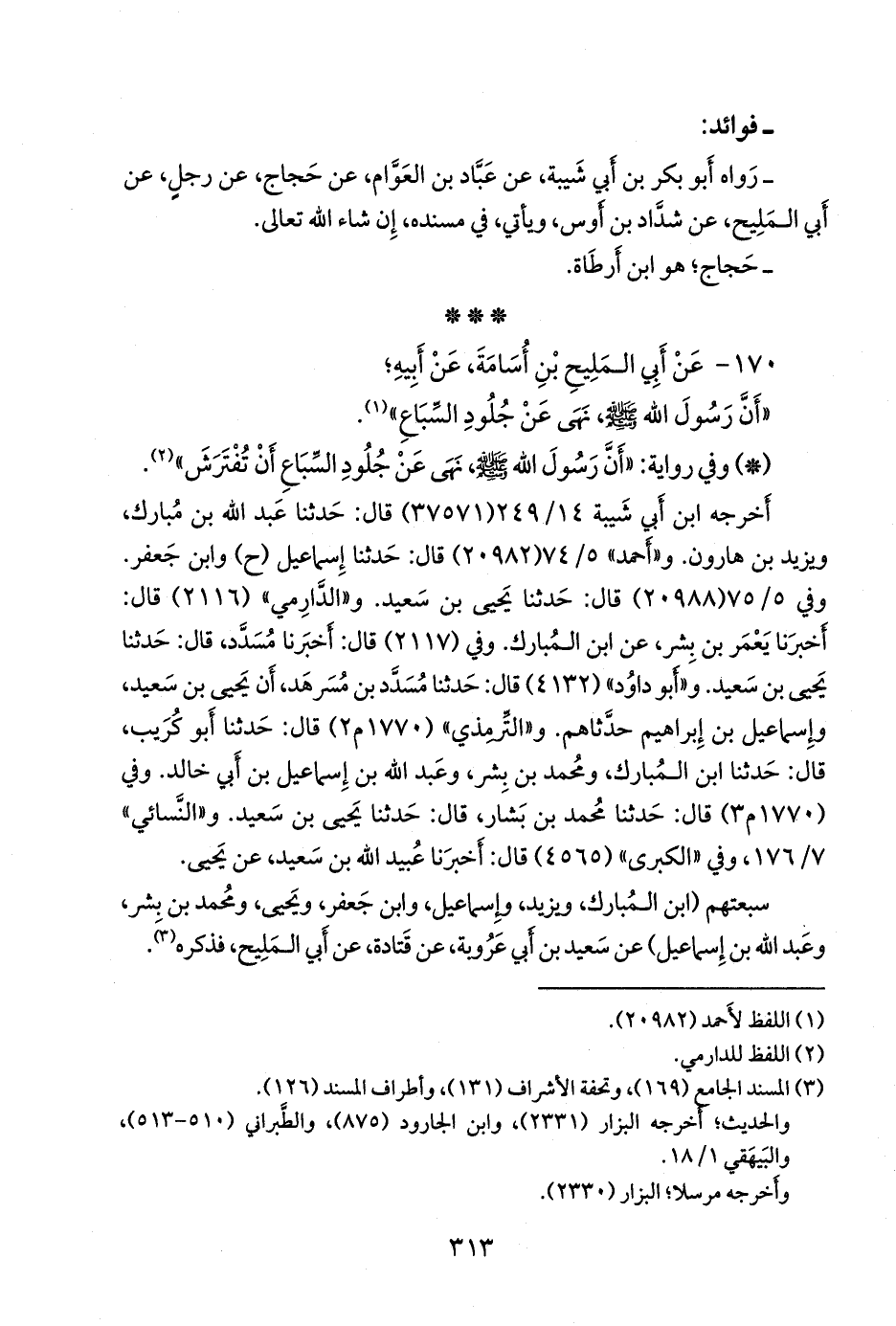 - وفي رواية: «أن رسول الله صَلى الله عَليه وسَلم نهى عن جلود السباع أن تفترش» (¬٢).