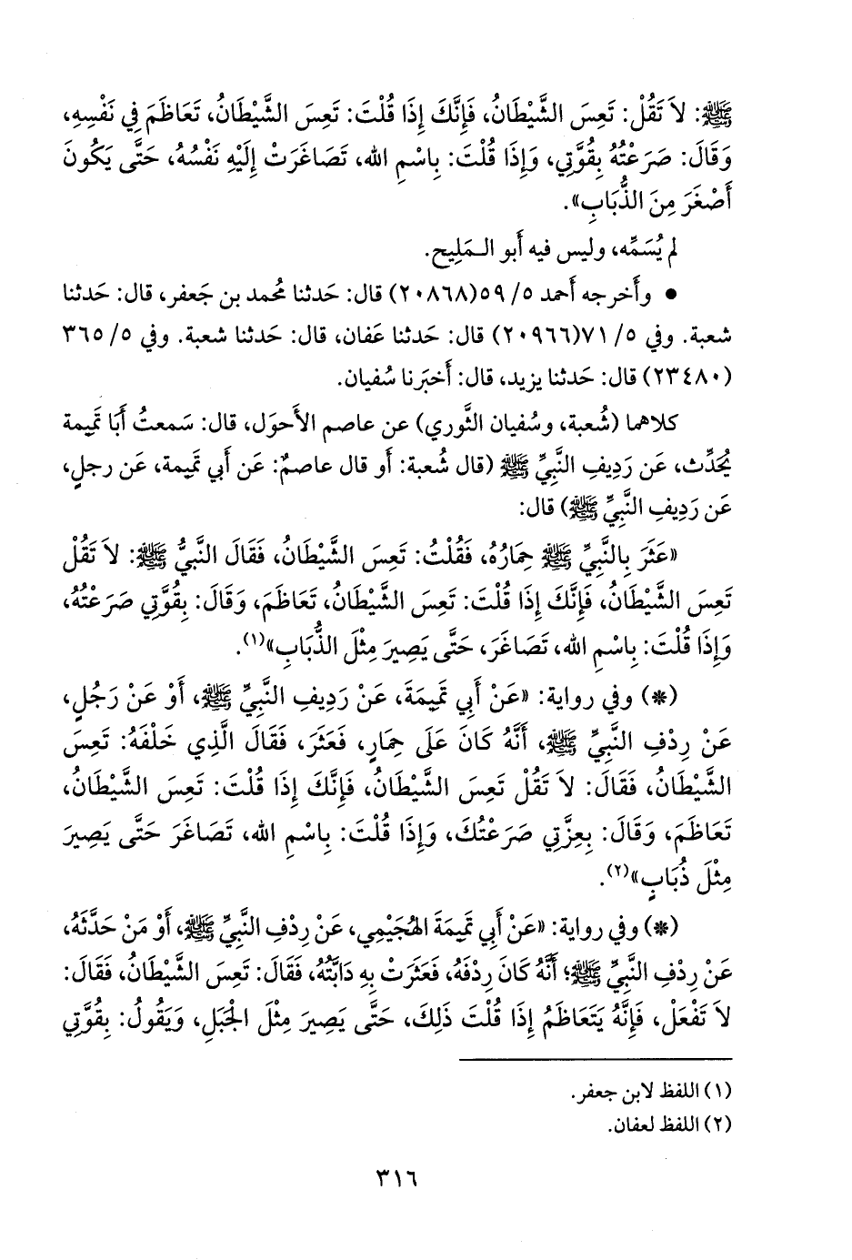 - وفي رواية: «عن أبي تميمة الهجيمي، عن ردف النبي صَلى الله عَليه وسَلم أو من حدثه، عن ردف النبي صَلى الله عَليه وسَلم؛ أنه كان ردفه، فعثرت به دابته، فقال: تعس الشيطان، فقال: لا تفعل، فإنه يتعاظم إذا قلت ذلك، حتى يصير مثل الجبل، ويقول: بقوتي