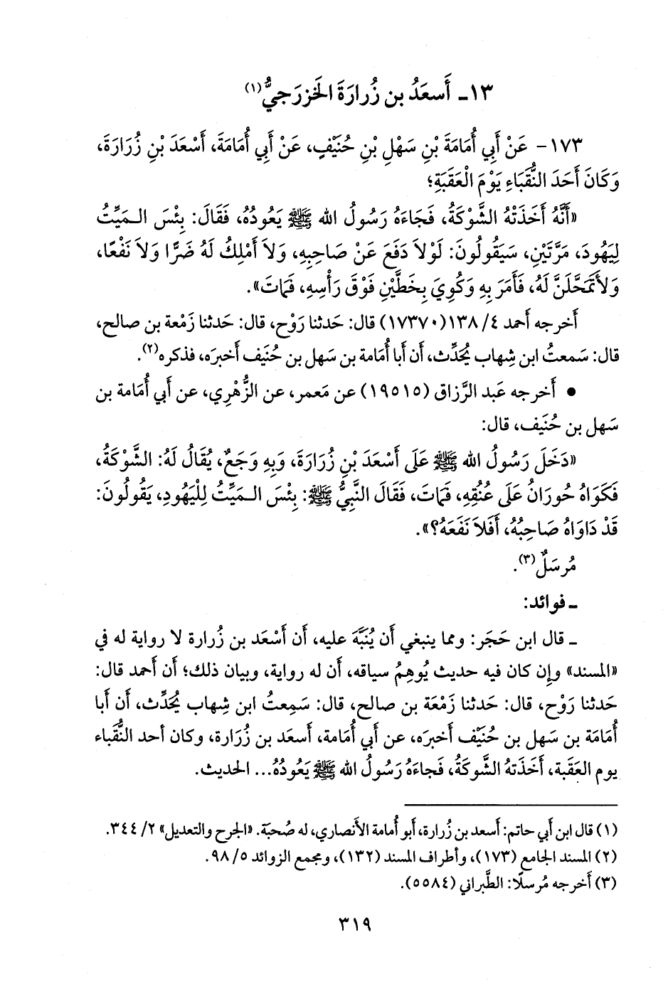 (¬١) قال ابن أبي حاتم: أسعد بن زُرارة، أَبو أمامة الأَنصاري، له صحبة. «الجرح والتعديل» ٢/ ٣٤٤.