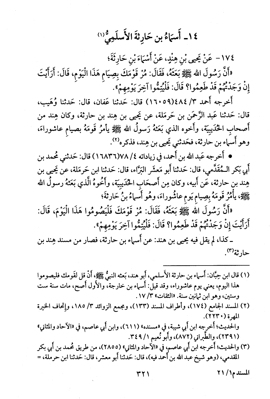 - أخرجه عبد الله بن أحمد، في زياداته ٤/ ٧٨ (١٦٨٣٦) قال: حدثني محمد بن أَبي بكر المُقَدَّمي، قال: حدثنا أَبو معشر البراء، قال: حدثنا ابن حَرملة، عن يحيى بن هند بن حارثة، عن أبيه، وكان من أصحاب الحُدَيبيَة، وأخوه الذي بعثه رسول الله صَلى الله عَليه وسَلم يأمر قومه بصيام يوم عاشوراء، وهو أسماء بن حارثة؛