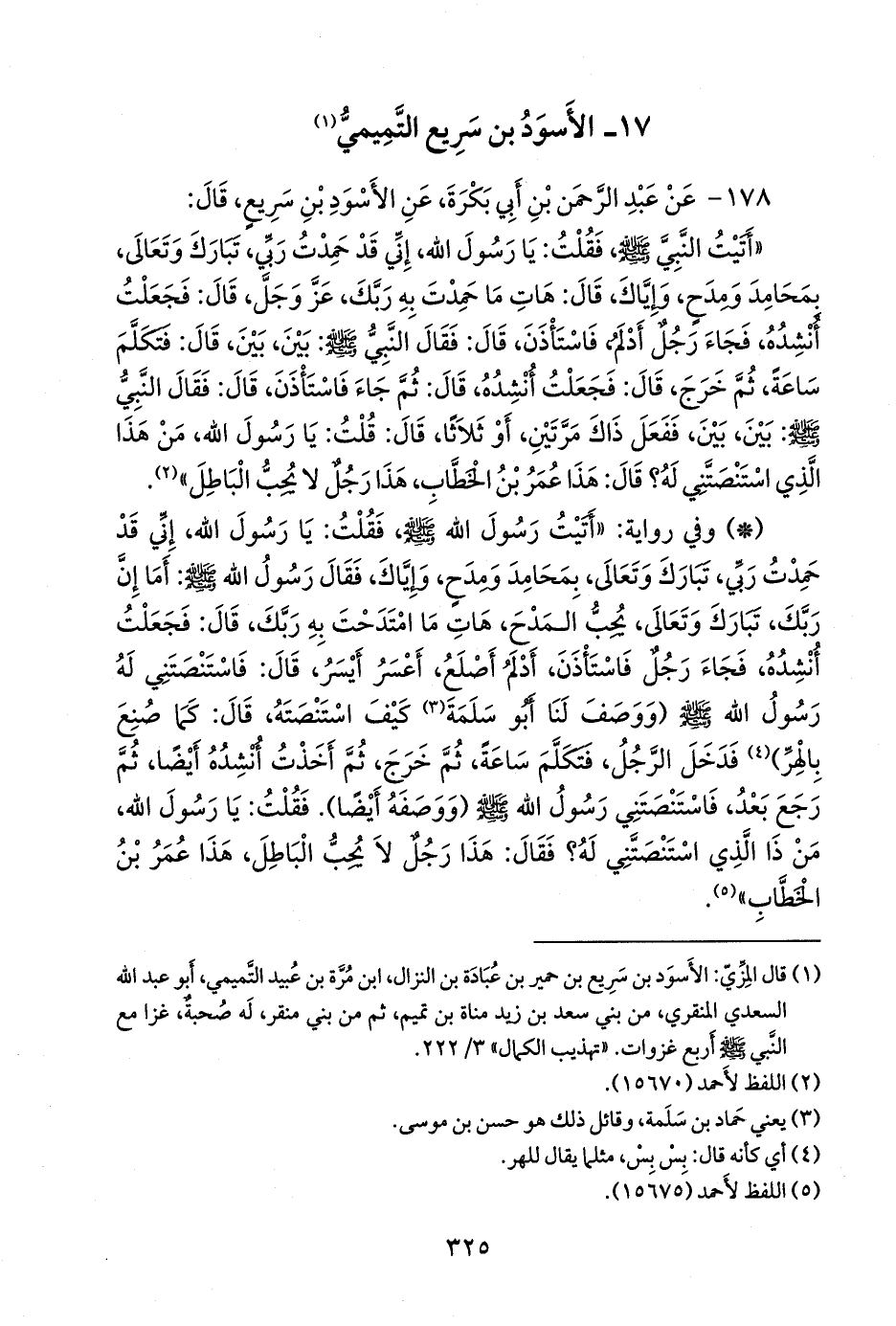 «أتيت النبي صَلى الله عَليه وسَلم فقلت: يا رسول الله، إني قد حمدت ربي، تبارك وتعالى، بمحامد ومدح، وإياك، قال: هات ما حمدت به ربك، عز وجل، قال: فجعلت أنشده، فجاء رجل أدلم، فاستأذن، قال: فقال النبي صَلى الله عَليه وسَلم: بين، بين، قال: فتكلم ساعة، ثم خرج، قال: فجعلت أنشده، قال: ثم جاء فاستأذن، قال: فقال النبي صَلى الله عَليه وسَلم: بين، بين، ففعل ذاك مرتين، أو ثلاثا، قال: قلت: يا رسول الله، من هذا الذي استنصتني له؟ قال: هذا عمر بن الخطاب، هذا رجل لا يحب الباطل» (¬٢).
