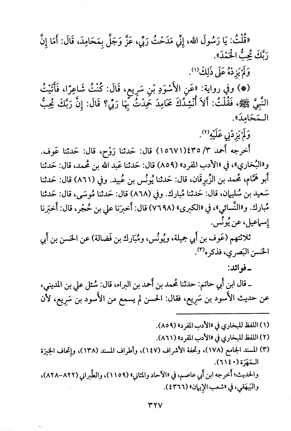 الأسود بن سريع خرج من البصرة أيام علي، رضي الله عنه، وكان الحسن بالمدينة، قلت له: قال المبارك، يعني ابن فضالة، في حديث الحسن، عن الأسود بن سريع، قال: أتيت النبي صَلى الله عَليه وسَلم فقلت: إني حمدت ربي بمحامد: أخبرني الأسود، فلم يعتمد على المبارك في ذلك. «المراسيل» (١٢٧).