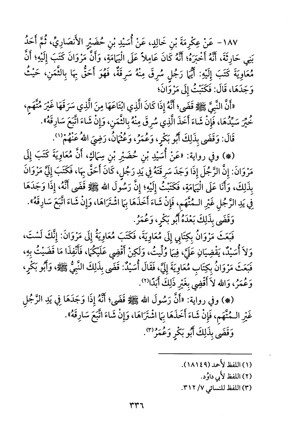 • حديث عكرمة بن خالد، عن أُسيد بن حُضير الأَنصاري، ثم أحد بني حارثة، أنه أخبره؛ أنه كان عاملا على اليمامة، وأن مروان كتب إليه؛ أن معاوية كتب إليه: أيما رجل سرق منه سرقة، فهو أحق بها بالثمن، حيث وجدها، قال: فكتبت إلى مروان؛