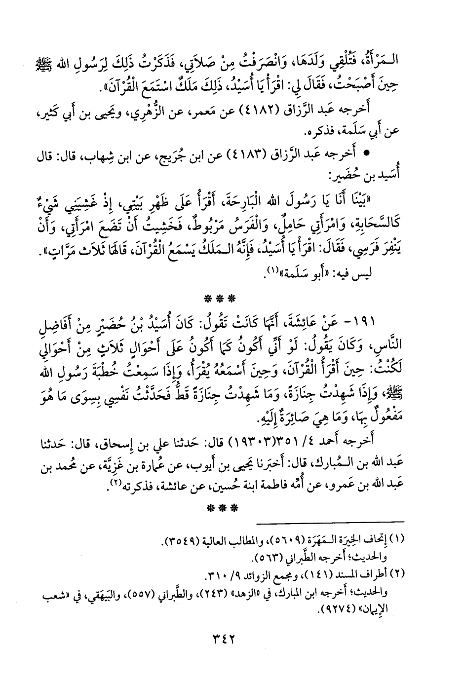 ١٩٠ - عن عائشة، أنها كانت تقول: كان أُسيد بن حُضير من أفاضل الناس، وكان يقول: لو أني أكون كما أكون على أحوال ثلاث من أحوالي لكنت: حين أقرأ القرآن، وحين أسمعه يقرأ، وإذا سمعت خطبة رسول الله صَلى الله عَليه وسَلم وإذا شهدت جِنازة، وما شهدت جِنازة قط فحدثت نفسي بسوى ما هو مفعول بها، وما هي صائرة إليه.