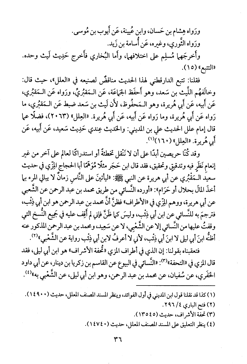 وقد كُنّا حريصين أبدًا على أن لا نَنْقل تخطئةً أو استدراكًا لعالم على آخر من غير إنعامِ نَظَرٍ فيه وتدقيقٍ وتحقيق، فقد قال ابن حَجَر مثلًا مُوَهّمًا أبا الحجاج المِزّي في حديث سعيد المَقْبُري عن أبي هريرة عن النبي - صلى الله عليه وسلم -: "ليأتينَ على النَّاسِ زمانٌ لا يبالي المرء بما أخذَ المالَ بحلال أو حَرَام": "أورده النَّسائي من طريق محمد بن عبد الرحمن عن الشَّعبي عن أبي هريرة، ووهم المِزّي في "الأطراف" فظنَّ أنَّ محمد بن عبد الرحمن هو ابن أبي ذِئْب، فترجمَ به للنَّسائي عن ابن أبي ذِئْب، وليسَ كما ظَنَّ فإني لم أَقِف عليه في جَمِيع النُّسخ التي وقفتُ عليها من النَّسائي إلا عن الشَّعْبِي، لا عن سَعِيد، ومحمد بن عبد الرحمن المذكور عنه أظنُّه ابنَ أبي ليلى لا ابنَ أبي ذِئْب، لأني لا أعرفُ لابن أبي ذِئْب رواية عن الشَّعْبي" (٢).
