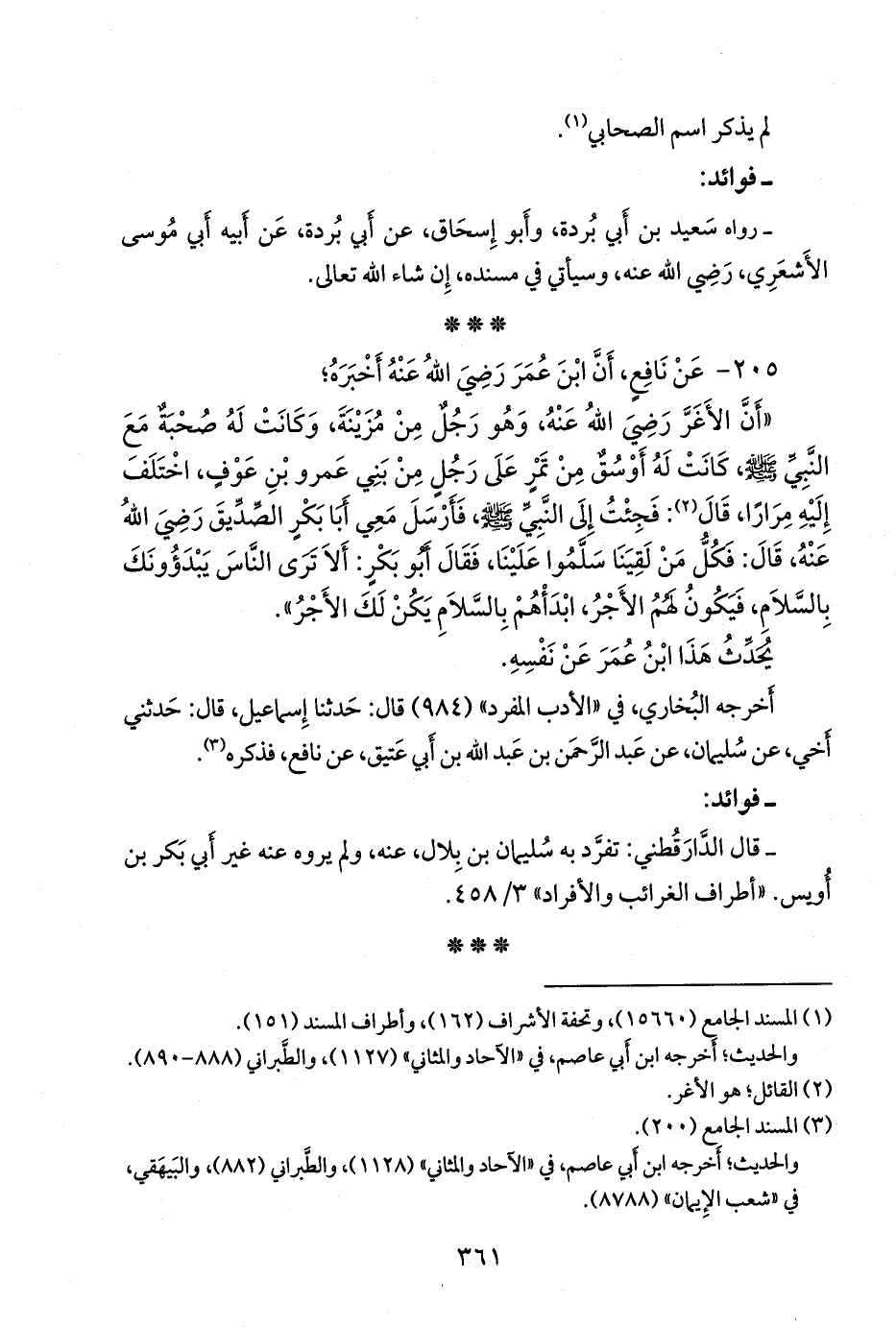 أخرجه البخاري في «الأدب المفرد» (٩٨٤) قال: حدثنا إسماعيل، قال: حدثني أخي، عن سليمان، عن عبد الرَّحمَن بن عبد الله بن أبي عتيق، عن نافع، فذكره (¬٢).
