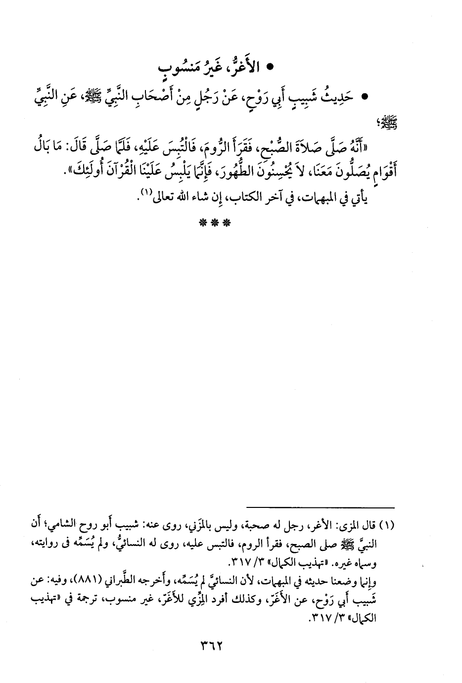 وإنما وضعنا حديثه في المبهمات، لأن النَّسَائي لم يُسَمِّه، وأخرجه الطبراني (٨٨١)، وفيه: عن شبيب أبي روح، عن الأغر، وكذلك أفرد المِزِّي للأغر، غير منسوب، ترجمة في «تهذيب الكمال» ٣/ ٣١٧.