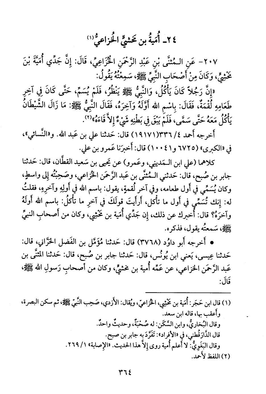 (¬١) قال ابن حجر: أُمَية بن مخشي، الخُزاعي، ويقال: الأزدي، صحب النبي صَلى الله عَليه وسَلم ثم سكن البصرة، وأعقب بها، قاله ابن سعد، وقال البخاري، وابن السكن: له صحبة، وحديث واحد، قال الدارقُطني في «الأفراد»: تفرد به جابر بن صبح، وقال البغوي: لا أعلم أمية روى إلا هذا الحديث. «الإصابة» ١/ ٢٦٩.