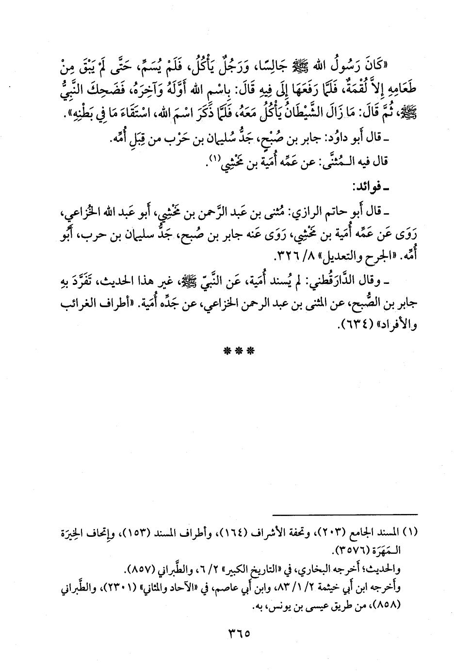 - قلنا: إِسناده ضعيفٌ؛ قال أَبو حاتم الرازي: مُثنى بن عبد الرَّحمَن بن مَخشي، أَبو عبد الله الخُزاعي، روى عن عَمِّه أُمَية بن مَخشي، روى عنه جابر بن صُبح، جَدُّ سليمان بن حرب، أَبو أُمِّه. «الجرح والتعديل» ٨/ ٣٢٦.