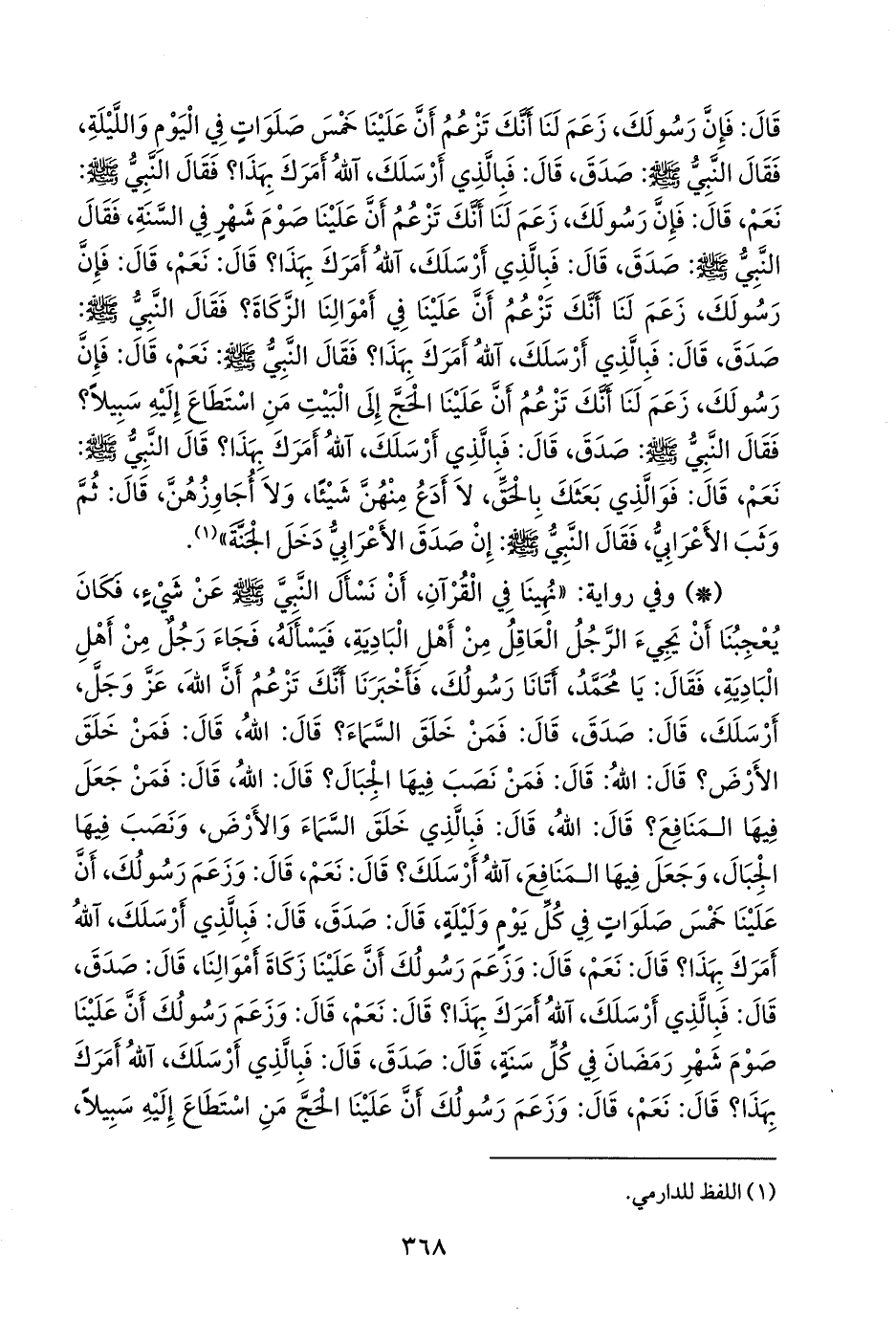 قال: فإِن رسولك زعم لنا أَنك تزعم أَن علينا صوم شهر في السنة، فقال النبي صَلى الله عَليه وسَلم: صدق، قال: فبالذي أَرسلك، آلله أَمرك بهذا؟ قال: نعم، قال: فإِن رسولك زعم لنا أَنك تزعم أَن علينا في أَموالنا الزكاة؟ فقال النبي صَلى الله عَليه وسَلم: صدق، قال: فبالذي أَرسلك، آلله أَمرك بهذا؟ فقال النبي صَلى الله عَليه وسَلم: نعم، قال: فإِن رسولك زعم لنا أَنك تزعم أَن علينا الحج إِلى البيت من استطاع إِليه سبيلا؟ فقال النبي صَلى الله عَليه وسَلم: صدق، قال: فبالذي أَرسلك، آلله أَمرك بهذا؟ قال النبي صَلى الله عَليه وسَلم: نعم، قال: فوالذي بعثك بالحق، لا أَدع منهن شيئا، ولا أُجاوزهن، قال: ثم وثب الأَعرابي، فقال النبي صَلى الله عَليه وسَلم: إِن صدق الأَعرابي دخل الجنة» (¬١).