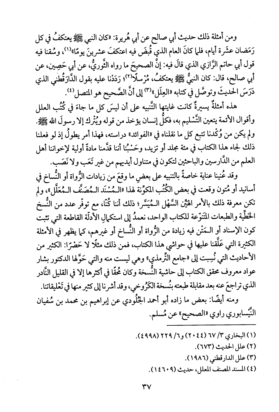 وقد عُنينا عناية خاصةً بالتنبيه على بعضِ ما وقعَ من زيادات الرُّواة أو النُّساخ في أسانيد أو مُتون وقعت في بعض الكُتُب المكوِّنة لهذا "المُسْنَد المُصَنَّف المُعَلَّل"، ولم تكن معرفة ذلك بالأمر الهَيِّن السَّهْل المُيَسَّر؛ ذلك أننا كُنّا، مع توفّر عدد من النُّسخ الخَطِّية والطبعات المتَنوّعة للكتاب الواحد، نعمدُ إلى استكمالِ الأدلّة القاطعة التي تثبت كون الإسناد أو المَتْن فيه زيادة من الرُّواة أو النُّساخ أو غيرهم، كما يظهر في الأمثلة الكثيرة التي عَلَّقنا عليها في حواشي هذا الكتاب، فمن ذلك مثلًا لا حَصْرًا: الكثير من الأحاديث التي نُسِبت إلى "جامع التِّرمذي" وهي ليست منه والتي حَوَّلها الدكتور بشار عواد معروف محقق الكتاب إلى حاشية النُّسخة وكان مُحقًا في أكثرها إلا في القليل النَّادر الذي تراجعَ عنه بعد مقابلة طبعته بنُسخة الكَرُوخي، وقد أشرنا إلى كثير منها في تَعْليقاتنا.