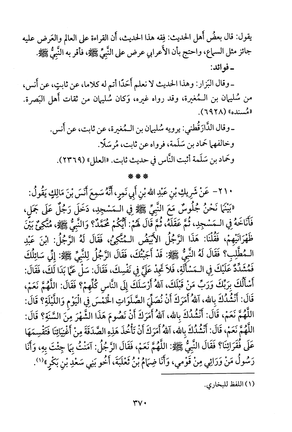 «بينما نحن جلوس مع النبي صَلى الله عَليه وسَلم في المسجد، دخل رجل على جمل، فأناخه في المسجد، ثم عقله، ثم قال لهم: أيكم محمد؟ والنبي صَلى الله عَليه وسَلم متكئ بين ظهرانيهم، فقلنا: هذا الرجل الأبيض المتكئ، فقال له الرجل: ابن عبد المطلب؟ فقال له النبي صَلى الله عَليه وسَلم: قد أجبتك، فقال الرجل للنبي صَلى الله عَليه وسَلم: إني سائلك فمشدد عليك في المسألة، فلا تجد علي في نفسك، فقال: سل عما بدا لك، فقال: أسألك بربك ورب من قبلك، آلله أرسلك إلى الناس كلهم؟ فقال: اللهم نعم، قال: أنشدك بالله، آلله أمرك أن نصلي الصلوات الخمس في اليوم والليلة؟ قال: اللهم نعم، قال: أنشدك بالله، آلله أمرك أن نصوم هذا الشهر من السنة؟ قال: اللهم نعم، قال: أنشدك بالله، آلله أمرك أن تأخذ هذه الصدقة من أغنيائنا فتقسمها على فقرائنا؟ فقال النبي صَلى الله عَليه وسَلم: اللهم نعم، فقال الرجل: آمنت بما جئت به، وأنا رسول من ورائي من قومي، وأنا ضمام بن ثعلبة، أخو بني سعد بن بكر» (¬١).