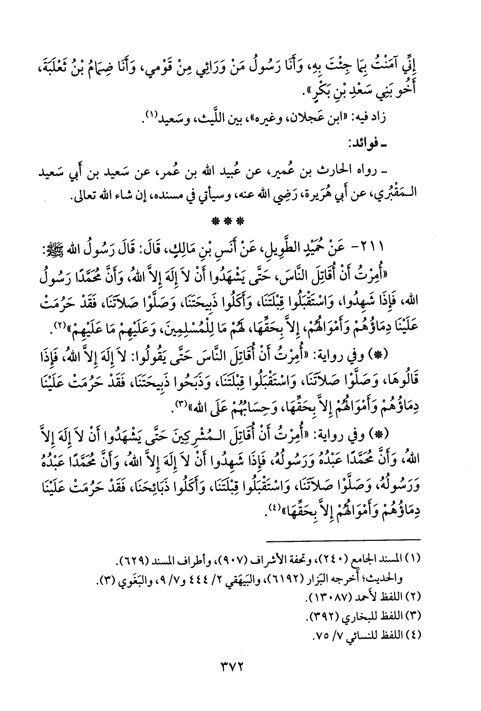 - وفي رواية: «أمرت أن أقاتل المشركين حتى يشهدوا أن لا إله إلا الله، وأن محمدا عبده ورسوله، فإذا شهدوا أن لا إله إلا الله، وأن محمدا عبده ورسوله، وصلوا صلاتنا، واستقبلوا قبلتنا، وأكلوا ذبائحنا، فقد حرمت علينا دماؤهم وأموالهم إلا بحقها» (¬٣).