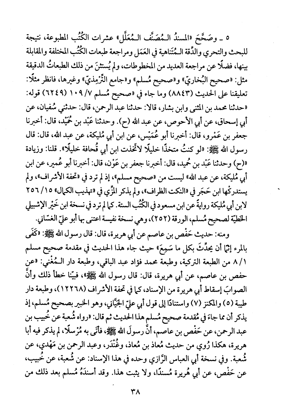 ومنه: حديث حَفْص بن عاصم عن أبي هريرة، قال: قال رسول الله - صلى الله عليه وسلم -: "كَفَى بالمرء إثمًا أن يحدِّثَ بكل ما سَمِعَ" حيث جاء هذا الحديث في مقدمة صحيح مسلم ١/ ٨ من الطبعة التركية، وطبعة محمد فؤاد عبد الباقي، وطبعة دار المُغْني: "عن حفص بن عاصم، عن أبي هريرة، قال: قال رسول الله - صلى الله عليه وسلم -"، فبيّنا خطأ ذلك وأنَّ الصوابَ إسقاط أبي هريرة من الإسناد، كما في تحفة الأشراف (١٢٢٦٨)، وطبعة دار طيبة (٥) والمكنز (٧) واستنادًا إلى قول أبي عليّ الجَيَّاني، وهو الخبير بصحيح مُسلم، إذ يذكر أن مما جاءَ في مُقدمة صحيح مُسلم هذا الحديث ثم قال: "رواه شُعبة عن خُبيب بن عبد الرحمن، عن حَفْص بن عاصم، أنَّ رسولَ الله - صلى الله عليه وسلم -، فأتَى به مُرْسلًا، لم يذكر فيه أبا هريرة، هكذا رُوي من حديث مُعاذ بن مُعاذ، وغُنْدَر، وعبد الرحمن بن مَهْدي، عن شُعبة. وفي نسخة أبي العباس الرَّازي وحده في هذا الإسناد: عن شُعبة، عن خُبيب، عن حَفْص، عن أبي هُريرة مُسندًا، ولا يثبت هذا. وقد أسندَهُ مُسلم بعد ذلك من