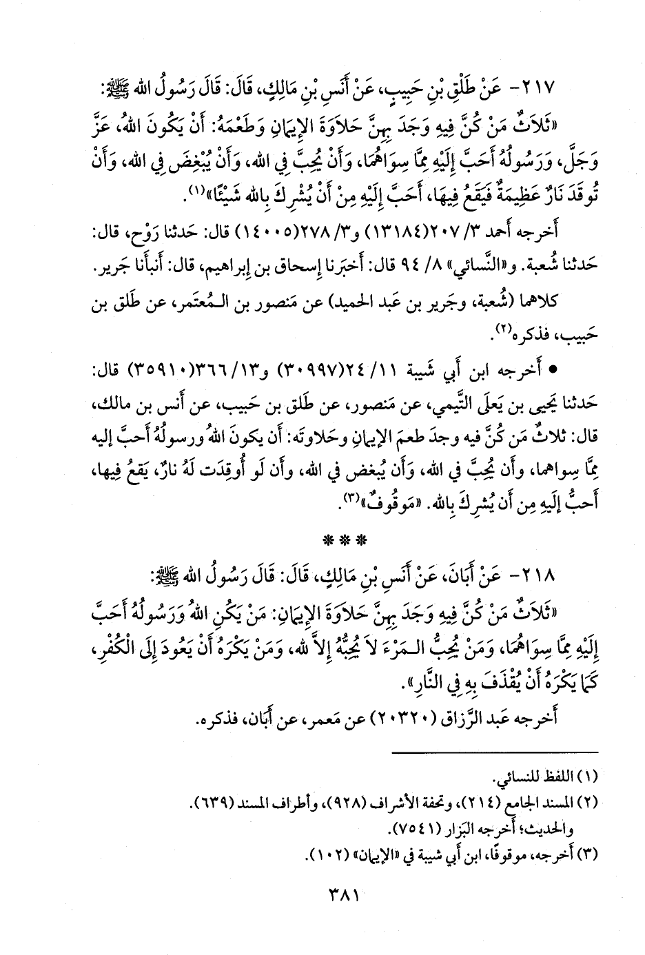 - أخرجه ابن أبي شيبة (٣٠٩٩٧) و ١٣/ ٣٦٦ (٣٥٩١٠) قال: حدثنا يحيى بن يَعلى التيمي، عن منصور، عن طلق بن حبيب، عن أَنس بن مالك، قال: ثلاث من كن فيه وجد طعم الإيمان وحلاوته: أن يكون الله ورسوله أحب إليه مما سواهما، وأن يحب في الله، وأن يبغض في الله، وأن لو أوقدت له نار، يقع فيها، أحب إليه من أن يشرك بالله. «موقوف» (¬٣).