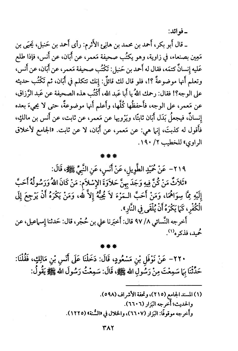 ٢١٩ - عن حميد الطويل، عن أَنس، عن النبي صَلى الله عَليه وسَلم قال: