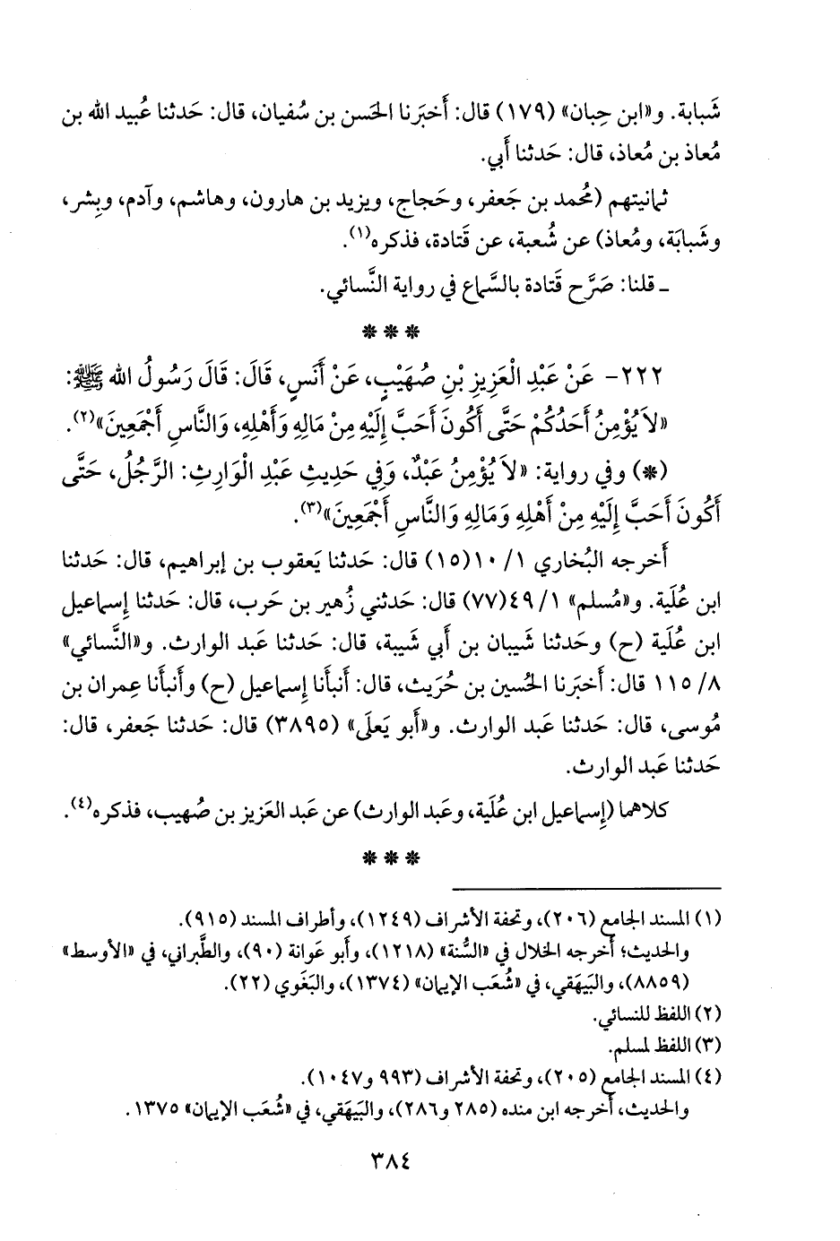 ٢٢٢ - عن عبد العزيز بن صُهَيب، عن أَنس، قال: قال رسول الله صَلى الله عَليه وسَلم: