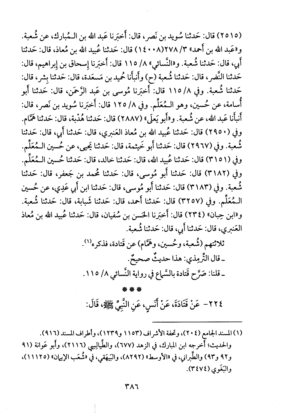 ٢٢٤ - عن قتادة، عن أَنس، عن النبي صَلى الله عَليه وسَلم قال: