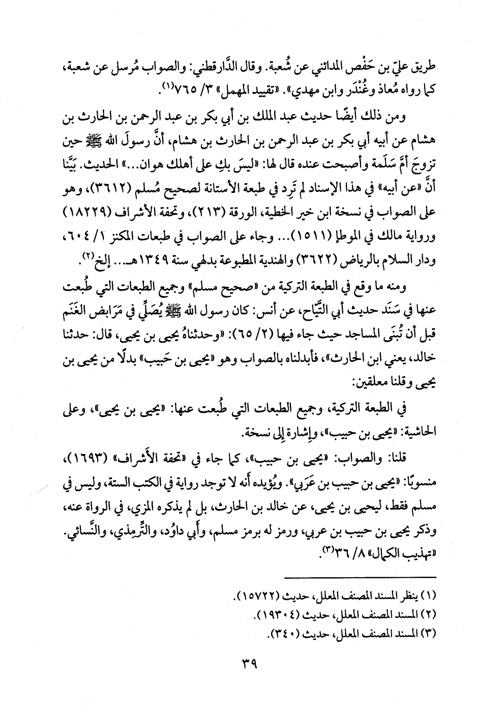 ومن ذلك أيضًا حديث عبد الملك بن أبي بكر بن عبد الرحمن بن الحارث بن هشام عن أبيه أبي بكر بن عبد الرحمن بن الحارث بن هشام، أنَّ رسولَ الله - صلى الله عليه وسلم - حين تزوجَ أمَّ سَلَمة وأصبحت عنده قال لها: "ليسَ بكِ على أهلك هوان ... " الحديث. بَيَّنا أنَّ "عن أبيه" في هذا الإسناد لم تَرِد في طبعة الأستانة لصحيح مُسلم (٣٦١٢)، وهو على الصواب في نسخة ابن خير الخطية، الورقة (٢١٣)، وتحفة الأشراف (١٨٢٢٩) ورواية مالك في الموطإ (١٥١١) ... وجاء على الصواب في طبعات المكنز ١/ ٦٠٤، ودار السلام بالرياض (٣٦٢٢) والهندية المطبوعة بدلهي سنة ١٣٤٩ هـ ... إلخ (٢).