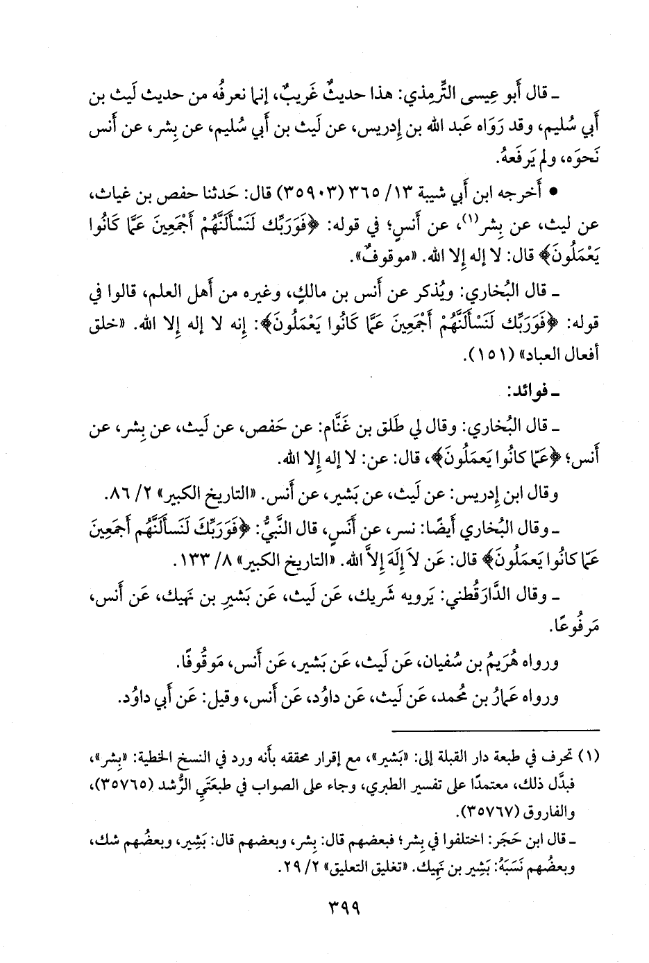 - وقال البخاري أيضا: نسر، عن أَنس، قال النبي: {فوربك لنسألنهم أجمعين. عما كانوا يعملون} قال: عن لا إله إلا الله». «التاريخ الكبير» ٨/ ١٣٣.