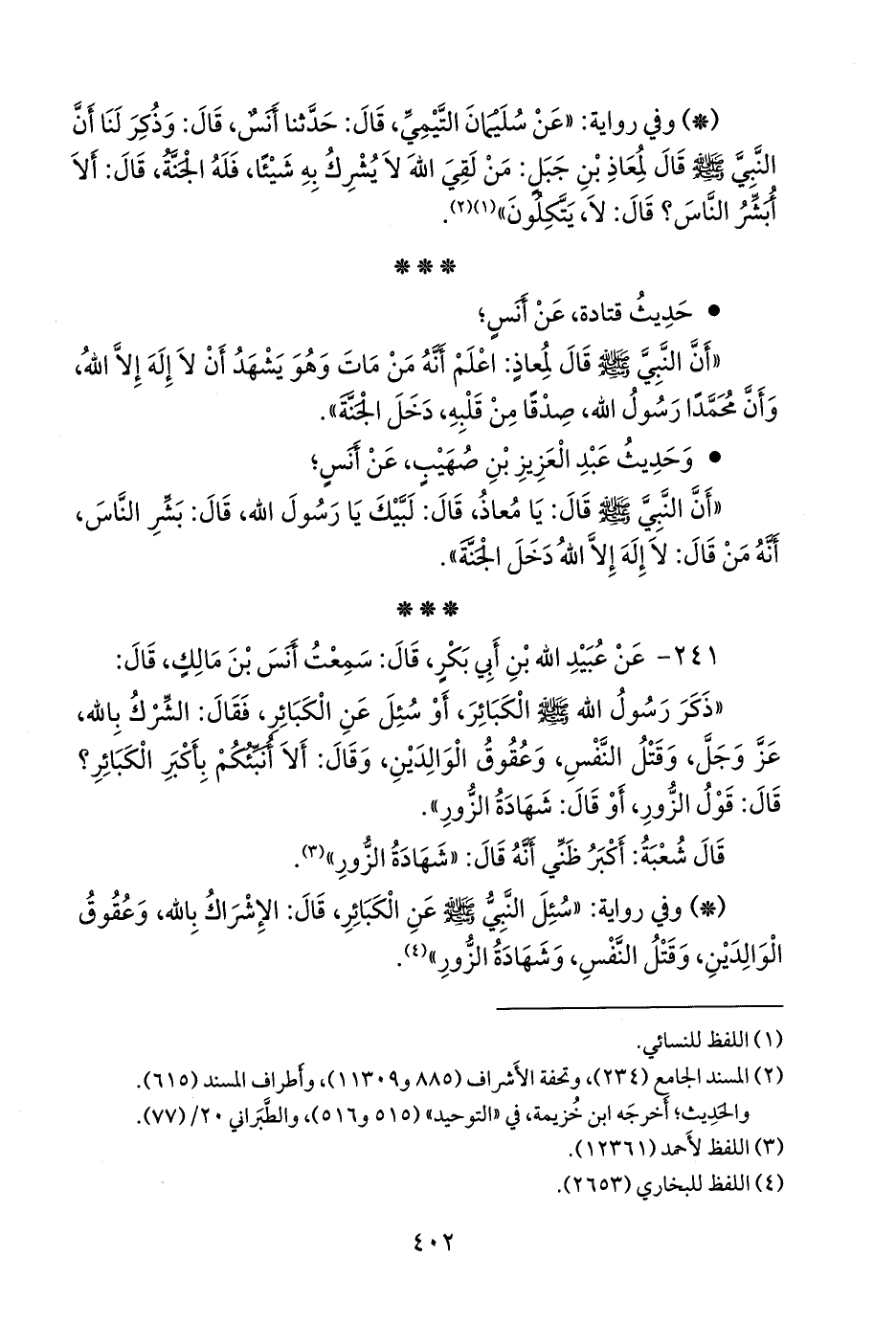 - وفي رواية: «سئل النبي صَلى الله عَليه وسَلم عن الكبائر، قال: الإشراك بالله، وعقوق الوالدين، وقتل النفس، وشهادة الزور» (¬٢).