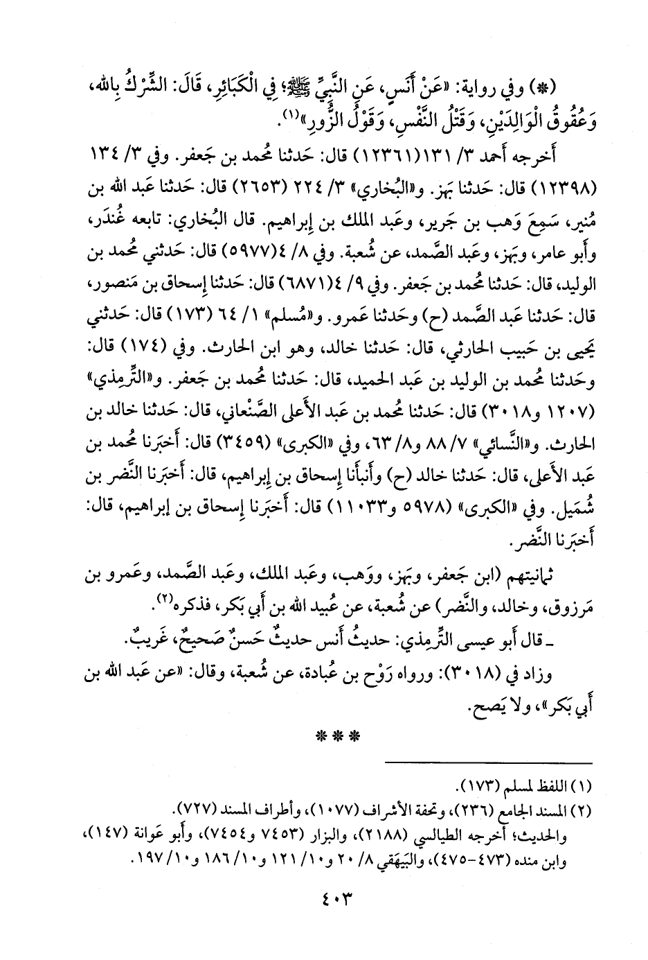 وفي ٨/ ٤ (٥٩٧٧) قال: حدثني محمد بن الوليد، قال: حدثنا محمد بن جعفر. وفي ٩/ ٣ (٦٨٧١) قال: حدثنا إسحاق بن منصور، قال: حدثنا عبد الصمد (ح) وحدثنا عَمرو. و «مسلم» ١/ ٦٤ (١٧٣) قال: حدثني يحيى بن حبيب الحارثي، قال: حدثنا خالد، وهو ابن الحارث. وفي (١٧٤) قال: وحدثنا محمد بن الوليد بن عبد الحميد، قال: حدثنا محمد بن جعفر. و «التِّرمِذي» (١٢٠٧ و ٣٠١٨) قال: حدثنا محمد بن عبد الأعلى الصَّنْعاني، قال: حدثنا خالد بن الحارث. و «النَّسَائي» ٧/ ٨٨ و ٨/ ٦٣، وفي «الكبرى» (٣٤٥٩) قال: أخبرنا محمد بن عبد الأعلى، قال: حدثنا خالد (ح) وأنبأنا إسحاق بن إبراهيم، قال: أخبرنا النضر بن شميل. وفي «الكبرى» (٥٩٧٨ و ١١٠٣٣) قال: أخبرنا إسحاق بن إبراهيم، قال: أخبرنا النضر.
