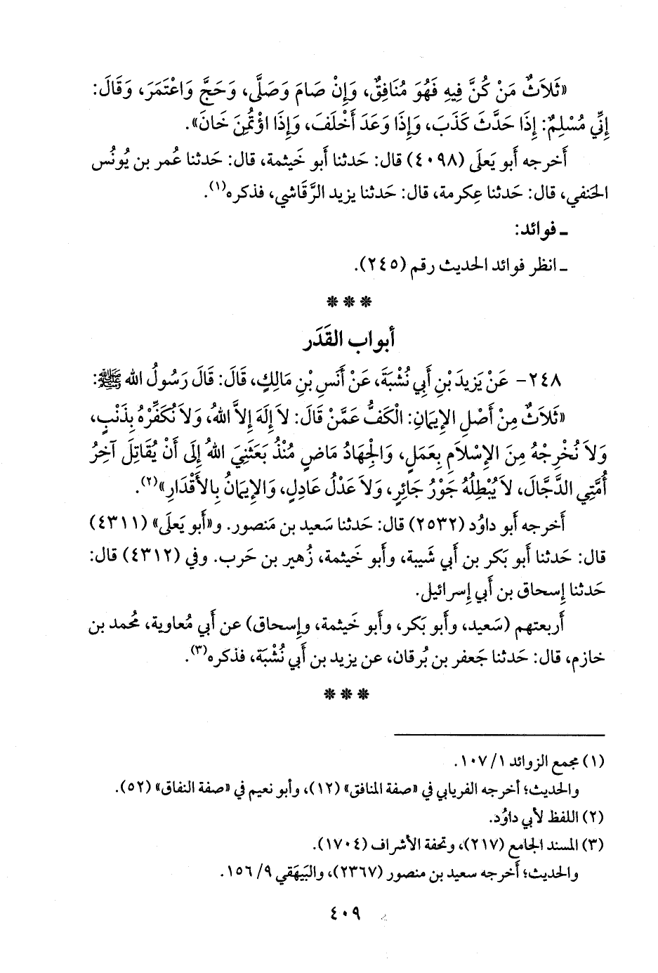 «ثلاث من أصل الإيمان: الكف عَمَّن قال: لا إله إلا الله، ولا نكفره بذنب، ولا نخرجه من الإسلام بعمل، والجهاد ماض منذ بعثني الله إلى أن يقاتل آخر أمتي الدجال، لا يبطله جور جائر، ولا عدل عادل، والإيمان بالأقدار» (¬١).