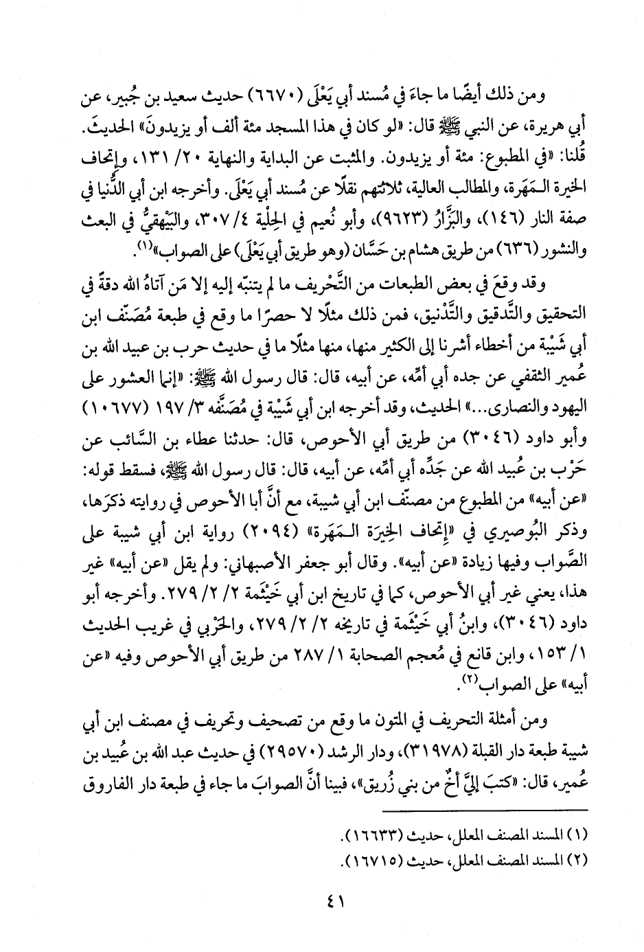 وقد وقعَ في بعض الطبعات من التَّحْريف ما لم يتنبّه إليه إلا مَن آتاهُ الله دقةً في التحقيق والتَّدقيق والتَّدْنيق، فمن ذلك مثلًا لا حصرًا ما وقع في طبعة مُصَنّف ابن أبي شَيْبة من أخطاء أشرنا إلى الكثير منها، منها مثلًا ما في حديث حرب بن عبيد الله بن عُمير الثقفي عن جده أبي أمِّه، عن أبيه، قال: قال رسول الله - صلى الله عليه وسلم -: "إنما العشور على اليهود والنصارى ... " الحديث، وقد أخرجه ابن أبي شَيْبة في مُصَنَّفه ٣/ ١٩٧ (١٠٦٧٧) وأبو داود (٣٠٤٦) من طريق أبي الأحوص، قال: حدثنا عطاء بن السَّائب عن حَرْب بن عُبيد الله عن جَدِّه أبي أمِّه، عن أبيه، قال: قال رسول الله - صلى الله عليه وسلم -، فسقط قوله: "عن أبيه" من المطبوع من مصنّف ابن أبي شيبة، مع أنَّ أبا الأحوص في روايته ذكرَها، وذكر البُوصيري في "إِتحاف الخِيرَة المَهَرة" (٢٠٩٤) رواية ابن أبي شيبة على الصَّواب وفيها زيادة "عن أبيه". وقال أبو جعفر الأصبهاني: ولم يقل "عن أبيه" غير هذا، يعني غير أبي الأحوص، كما في تاريخ ابن أبي خَيْثَمة ٢/ ٢/ ٢٧٩. وأخرجه أبو داود (٣٠٤٦)، وابنُ أبي خَيْثَمة في تاريخه ٢/ ٢/ ٢٧٩، والحَرْبي في غريب الحديث ١/ ١٥٣، وابن قانع في مُعجم الصحابة ١/ ٢٨٧ من طريق أبي الأحوص وفيه "عن أبيه" على الصواب (٢).