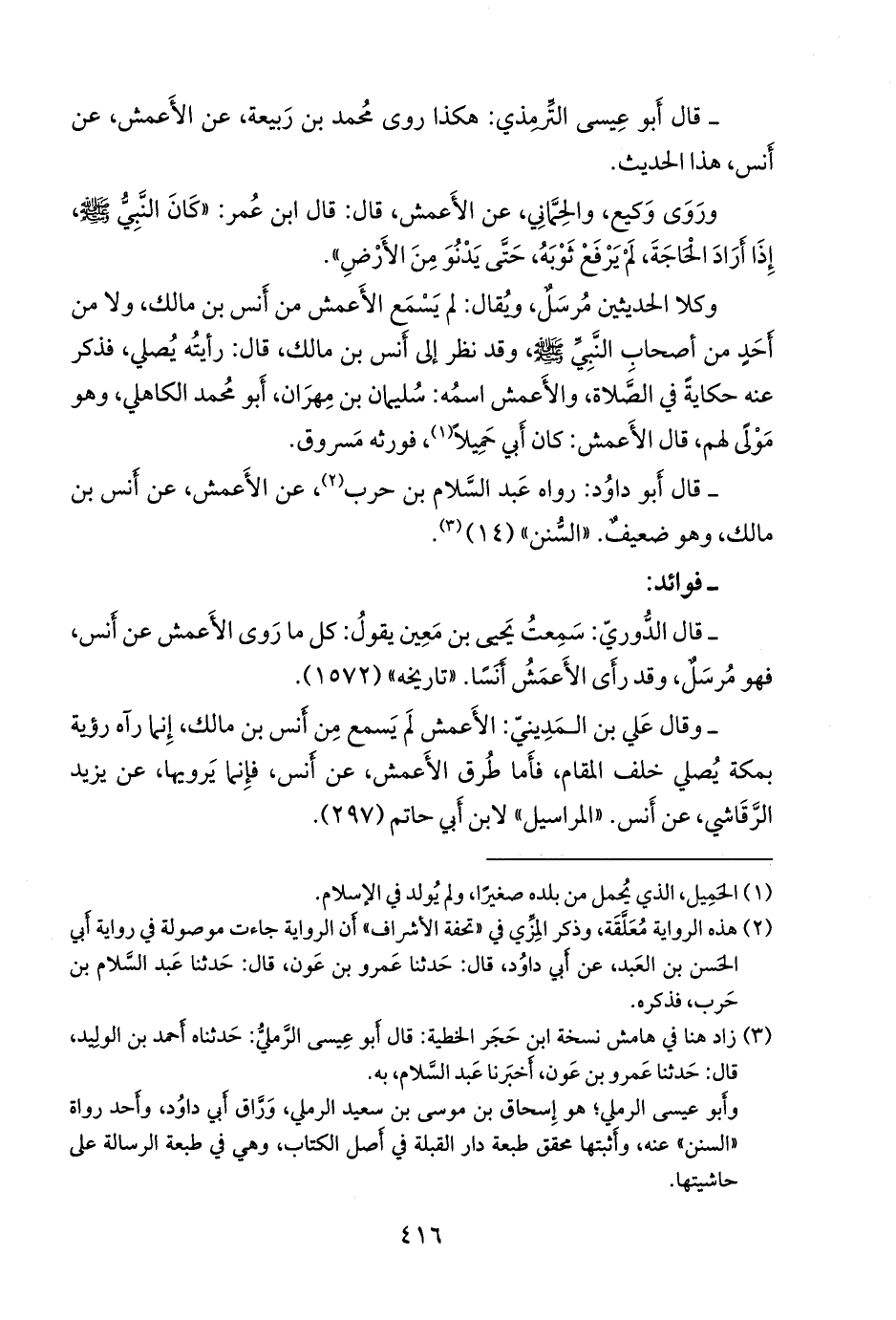 - وقال علي بن المديني: الأَعمش لم يسمع من أَنس بن مالك، إِنما رآه رؤية بمكة يصلي خلف المقام، فأَما طُرق الأَعمش، عن أَنس، فإِنما يرويها، عن يزيد الرَّقَاشي، عن أَنس. «المراسيل» لابن أَبي حاتم (٢٩٧).