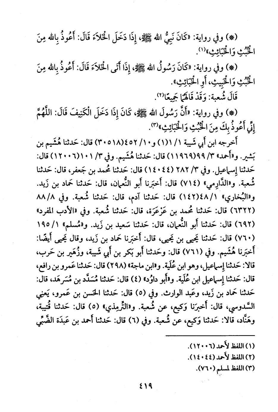 و «الدَّارِمي» (٧١٤) قال: أخبرنا أَبو النعمان، قال: حدثنا حماد بن زيد. و «البخاري» ١/ ٤٠ (١٤٢) قال: حدثنا آدم، قال: حدثنا شعبة. وفي ٨/ ٧١ (٦٣٢٢) قال: حدثنا محمد بن عرعرة، قال: حدثنا شعبة. وفي «الأدب المفرد» (٦٩٢) قال: حدثنا أَبو النعمان، قال: حدثنا سعيد بن زيد. و «مسلم» ١/ ١٩٥ (٧٦٠) قال: حدثنا يحيى بن يحيى، قال: أخبرنا حماد بن زيد، وقال يحيى أيضا: أخبرنا هُشيم. وفي (٧٦١) قال: وحدثنا أَبو بكر بن أبي شيبة، وزهير بن حرب، قالا: حدثنا إسماعيل، وهو ابن عُلَية. و «ابن ماجة» (٢٩٨) قال: حدثنا عَمرو بن رافع، قال: حدثنا إسماعيل ابن عُلَية. و «أَبو داود» (٤) قال: حدثنا مُسَدد بن مُسَرهد، قال: حدثنا حماد بن زيد، وعبد الوارث. وفي (٥) قال: حدثنا الحسن بن عَمرو، يعني السدوسي، قال: أخبرنا وكيع، عن شعبة. و «التِّرمِذي» (٥) قال: حدثنا قتيبة، وهناد، قالا: حدثنا وكيع، عن شعبة. وفي (٦) قال: حدثنا أحمد بن عَبدة الضبي