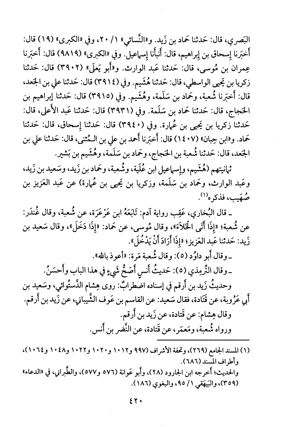 ثمانيتهم (هُشيم، وإسماعيل ابن عُلَية، وشعبة، وحماد بن زيد، وسعيد بن زيد، وعبد الوارث، وحماد بن سلمة، وزكريا بن يحيى بن عمارة) عن عبد العزيز بن صُهَيب، فذكره (¬١).