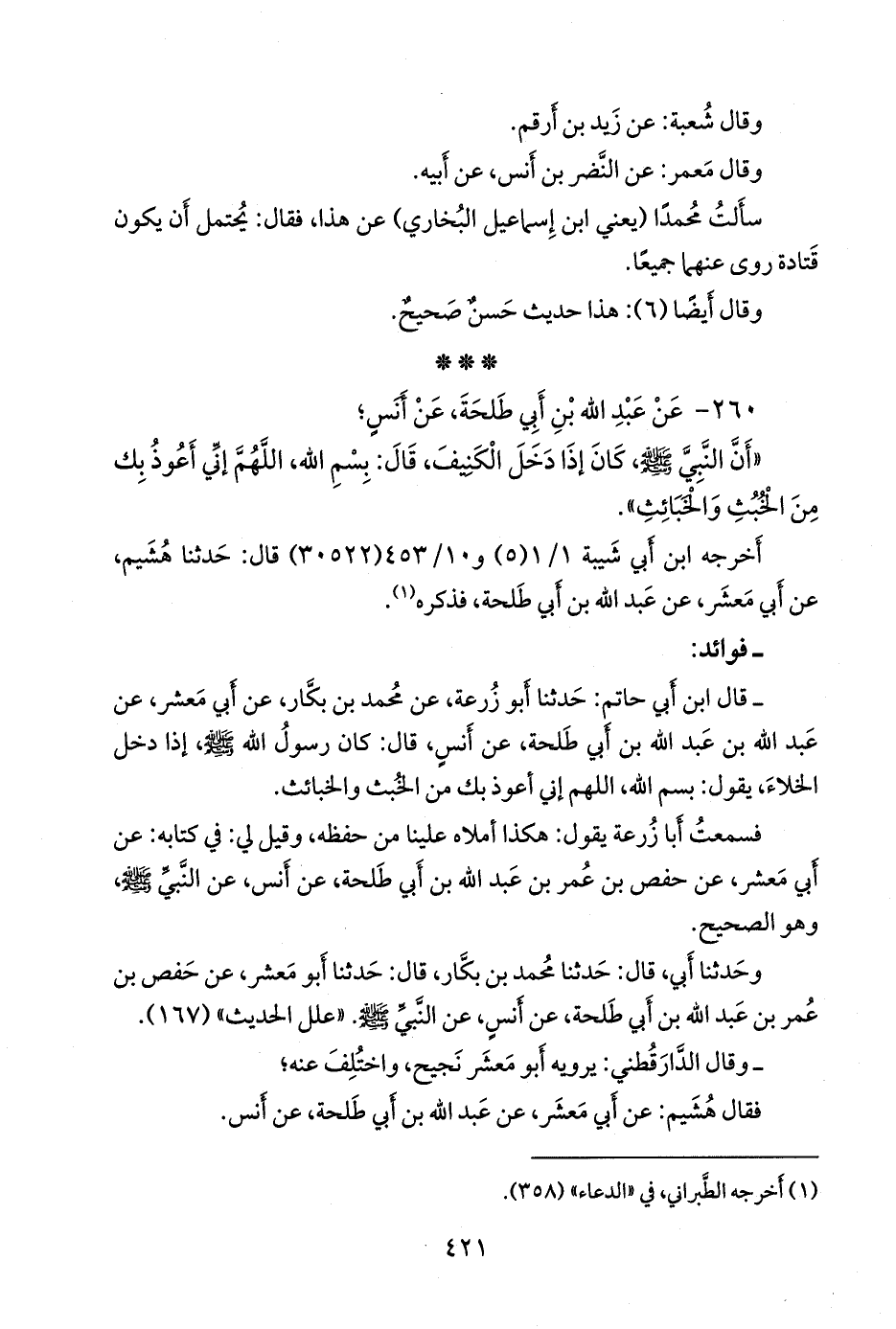 - قال عبد الرَّحمَن بن أبي حاتم الرازي: حدثنا أَبو زُرعَة، عن محمد بن بكار، عن أبي معشر، عن عبد الله بن عبد الله بن أبي طلحة، عن أَنس، قال: كان رسول الله صَلى الله عَليه وسَلم إذا دخل الخلاء، يقول: بسم الله، اللهم إني أعوذ بك من الخبث والخبائث.