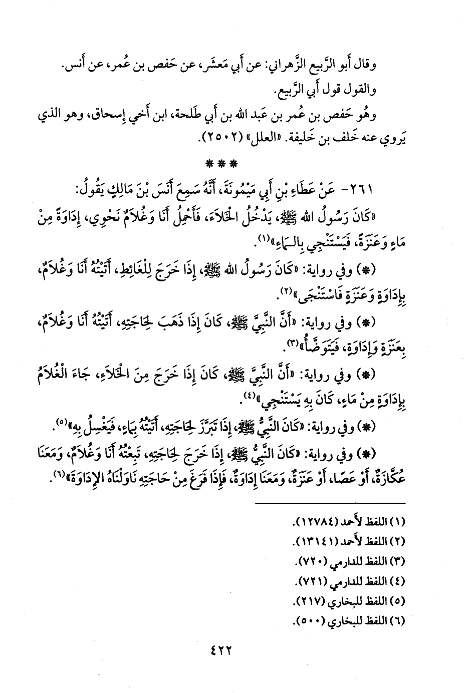 «كان رسول الله صَلى الله عَليه وسَلم يدخل الخلاء، فأحمل أنا وغلام نحوي، إداوة من ماء وعنزة، فيستنجي بالماء» (¬١).