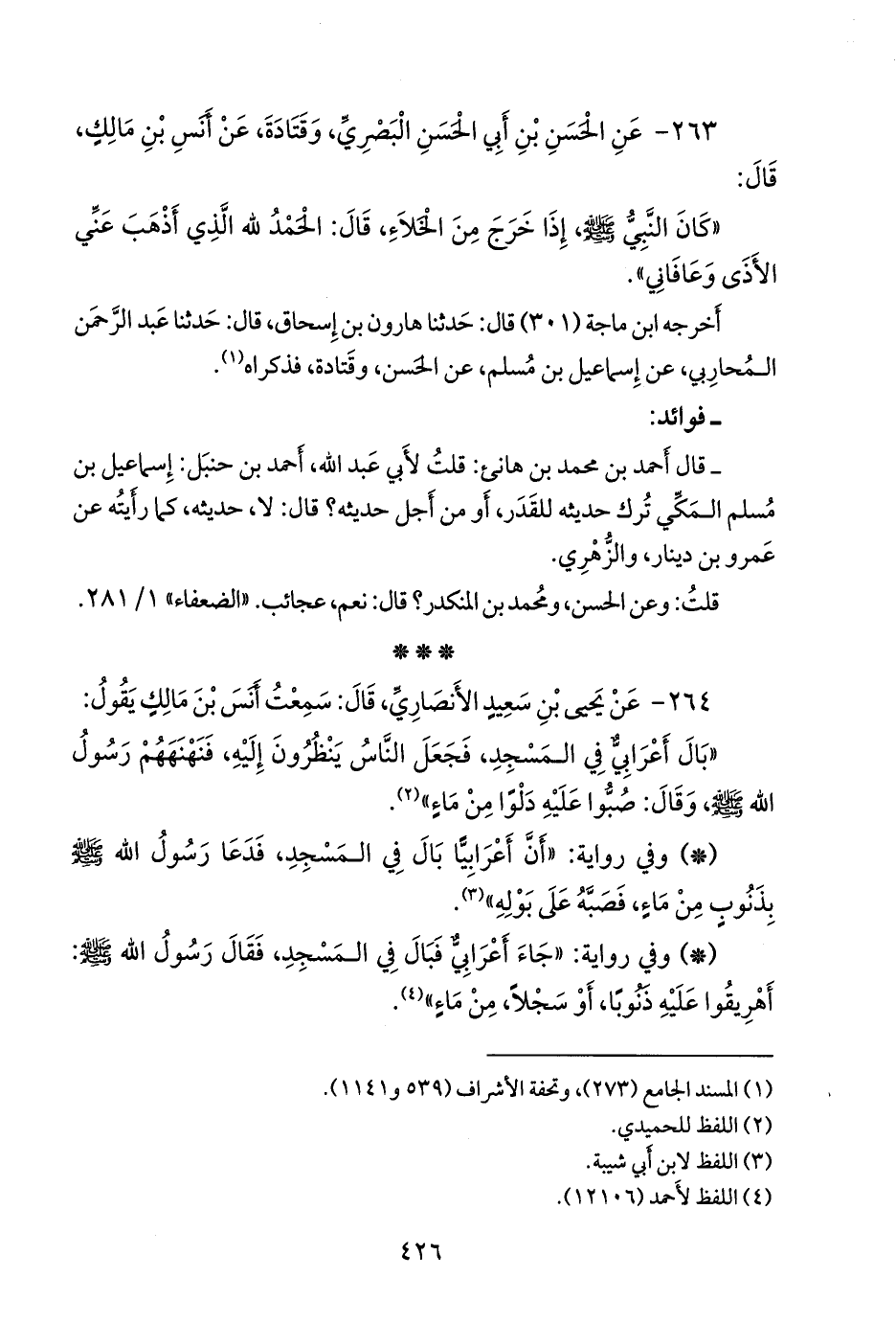 - وفي رواية: «دخل أعرابي المسجد على عهد رسول الله صَلى الله عَليه وسَلم فبال، فنهوه، فقال رسول الله صَلى الله عَليه وسَلم: دعوه، وأمر أن يصب عليه، أو أهريق عليه الماء» (¬٤).