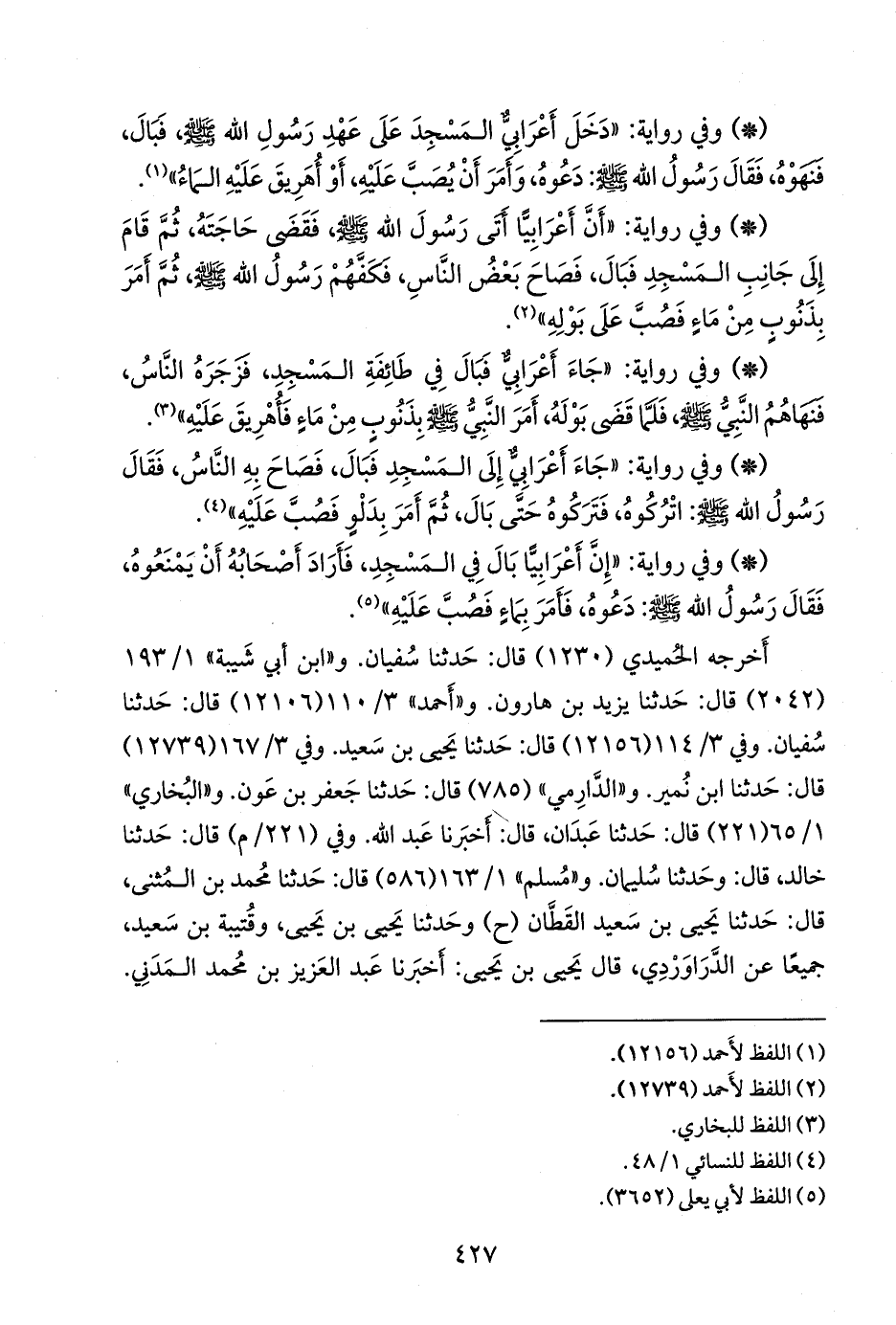 - وفي رواية: «إن أعرابيا بال في المسجد، فأراد أصحابه أن يمنعوه، فقال رسول الله صَلى الله عَليه وسَلم: دعوه، فأمر بماء فصب عليه» (¬٣).